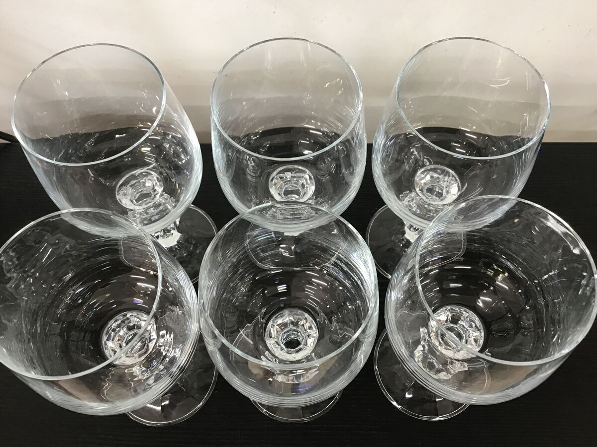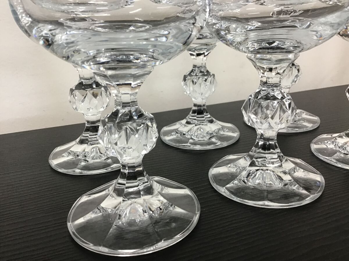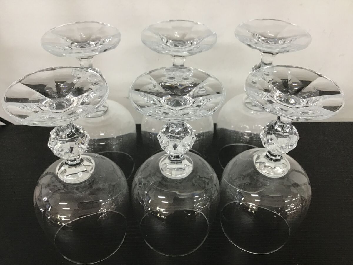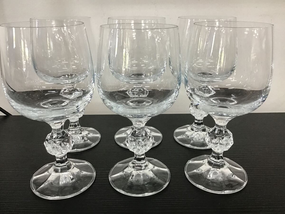 Lot of 6 Bohemia Crystal 'Claudia' pattern wine glasses - plain bowls, with a faceted sphere detail on the stem and textured footing.