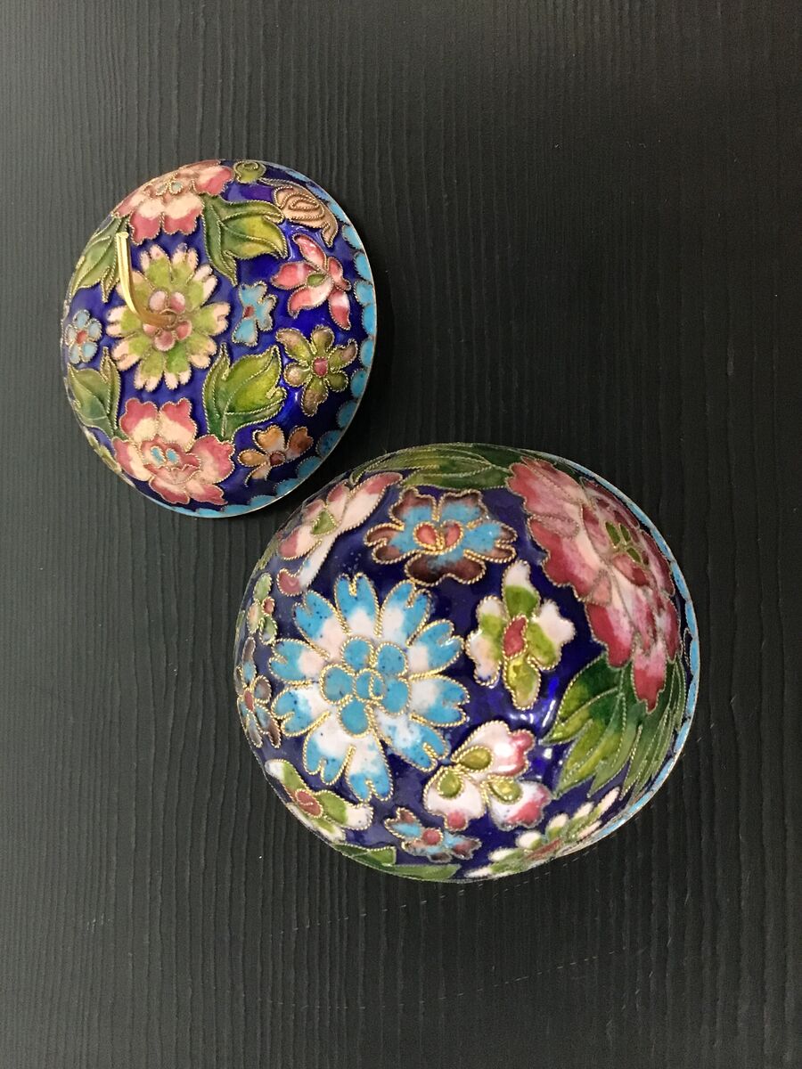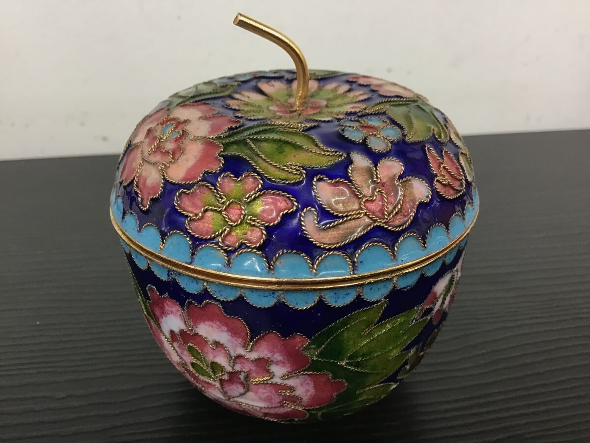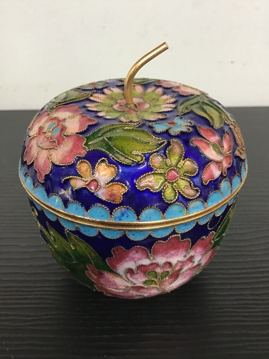 Vintage Chinese cloisonne trinket dish, shaped like an apple, complete with brass stem.