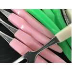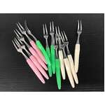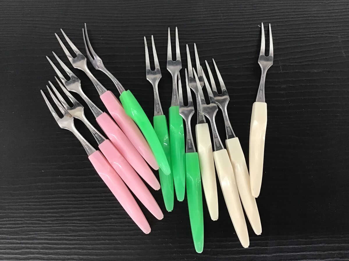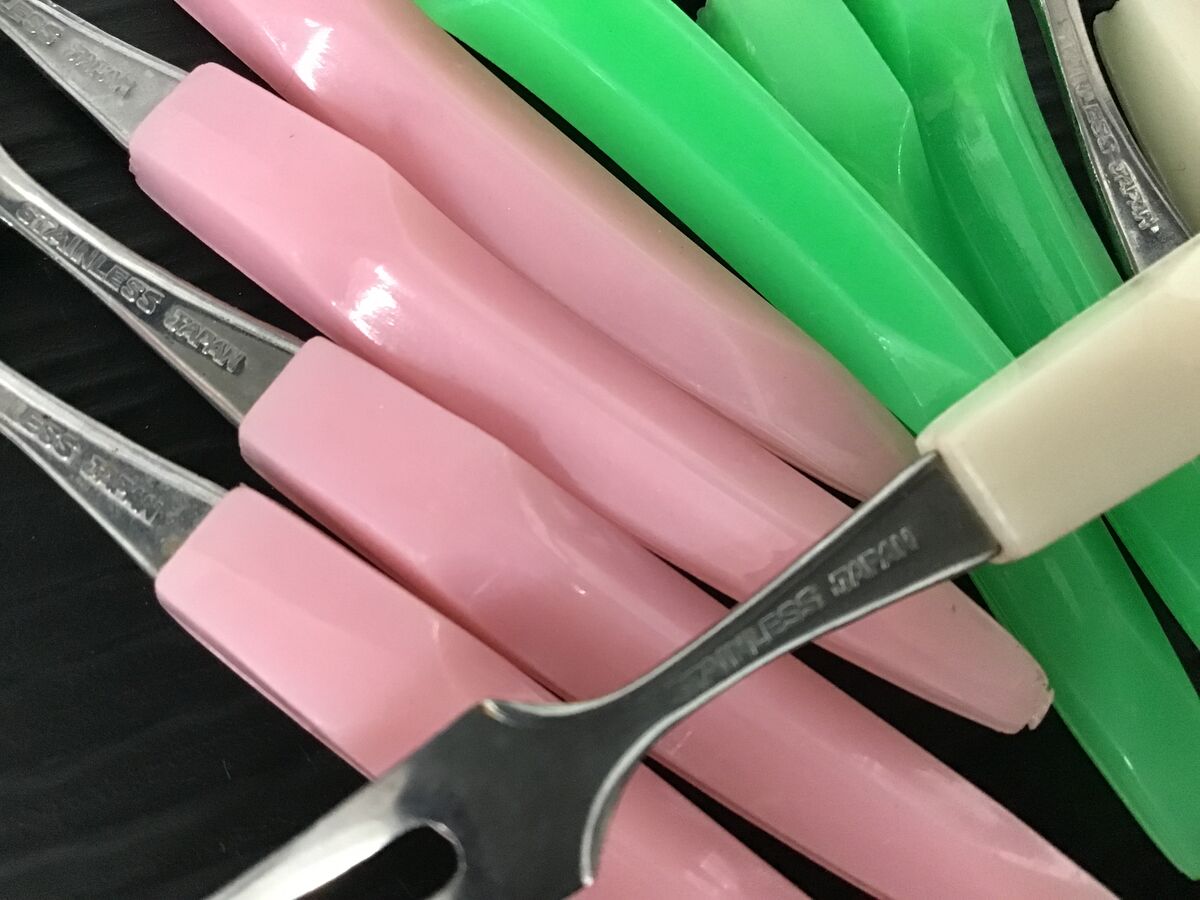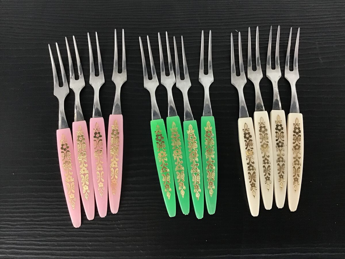 - Stainless steel tines and plastic handles, 4 each in pink, green and white handles (alll decorated with a gold flower motif).