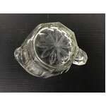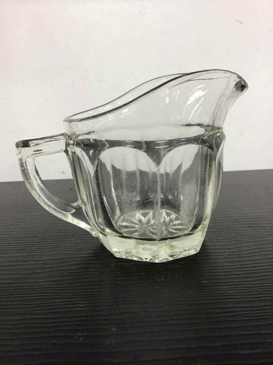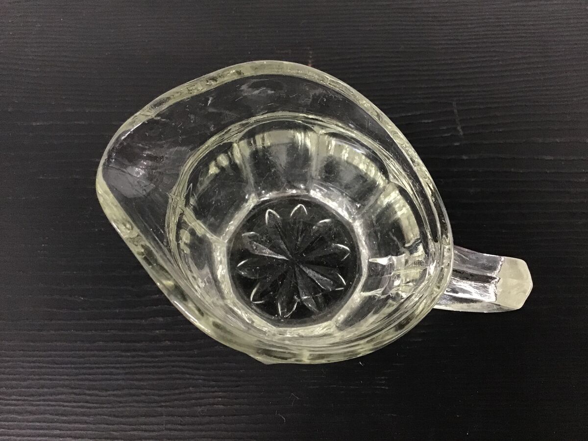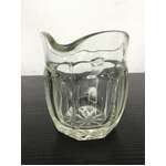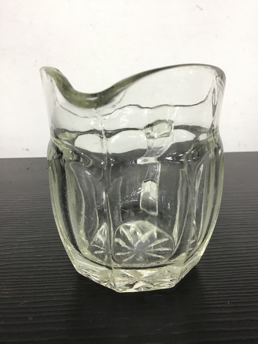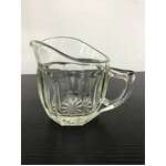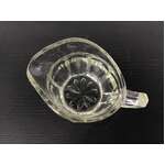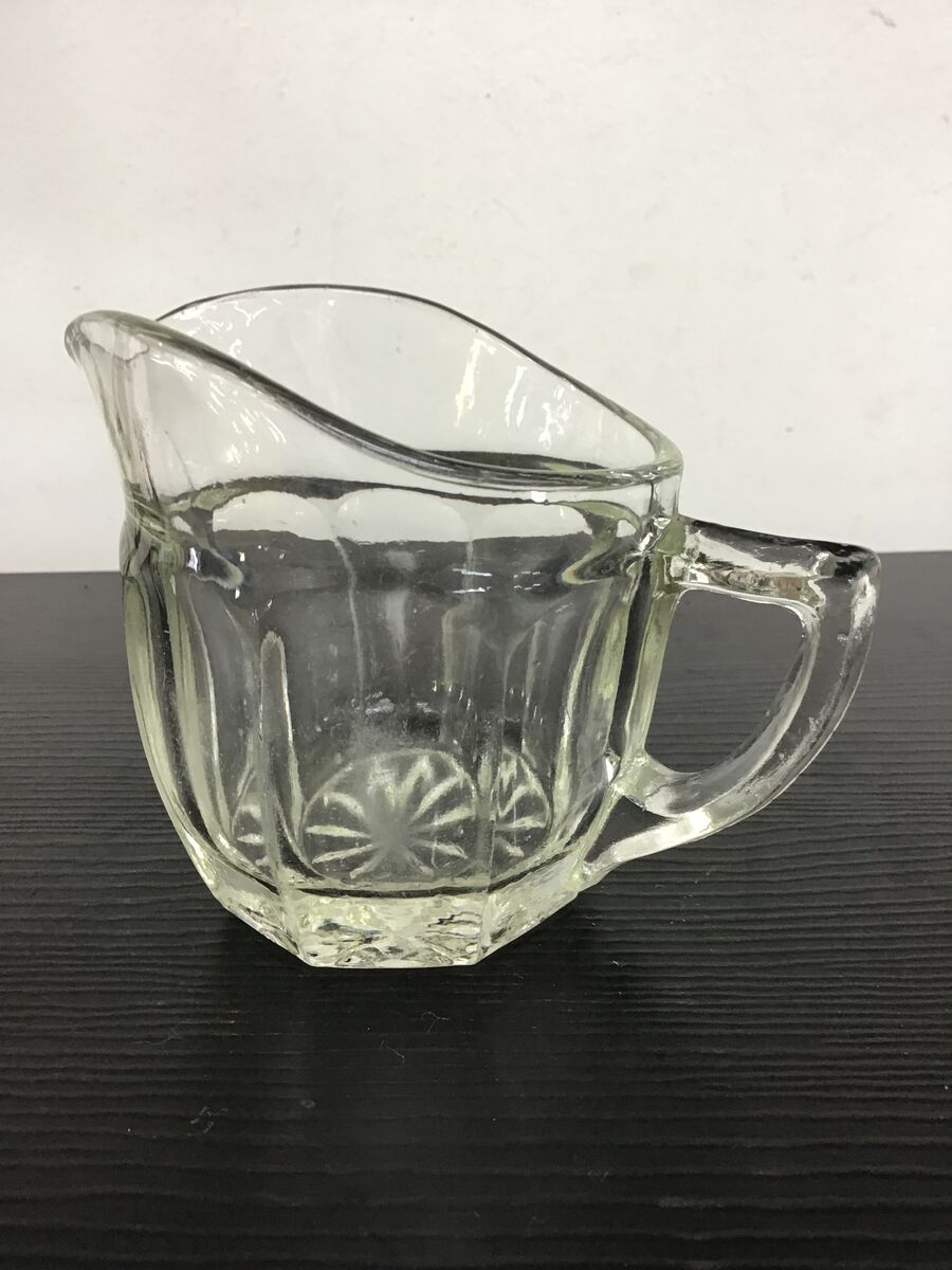 Depression glass era creamer jug with a starburst base and ribbed sides.
