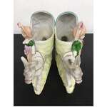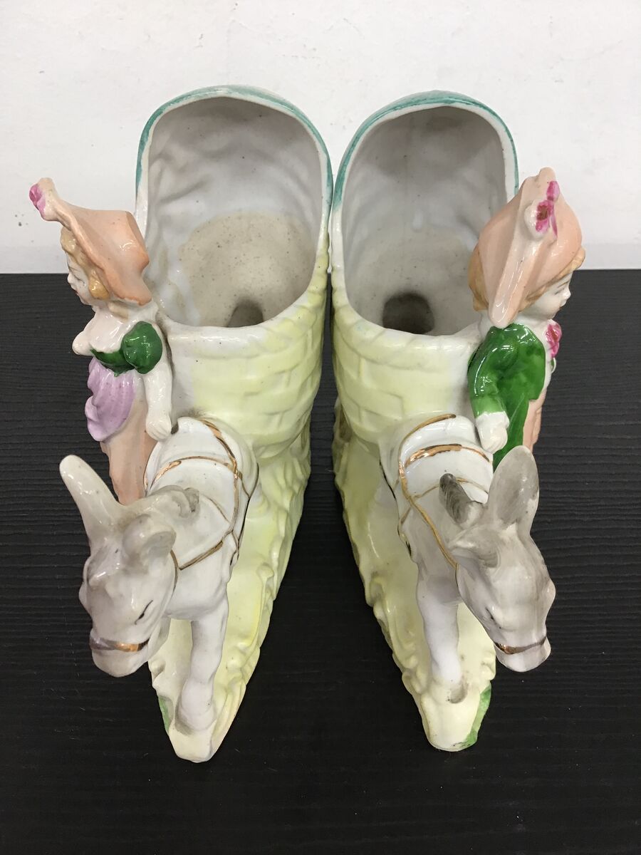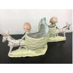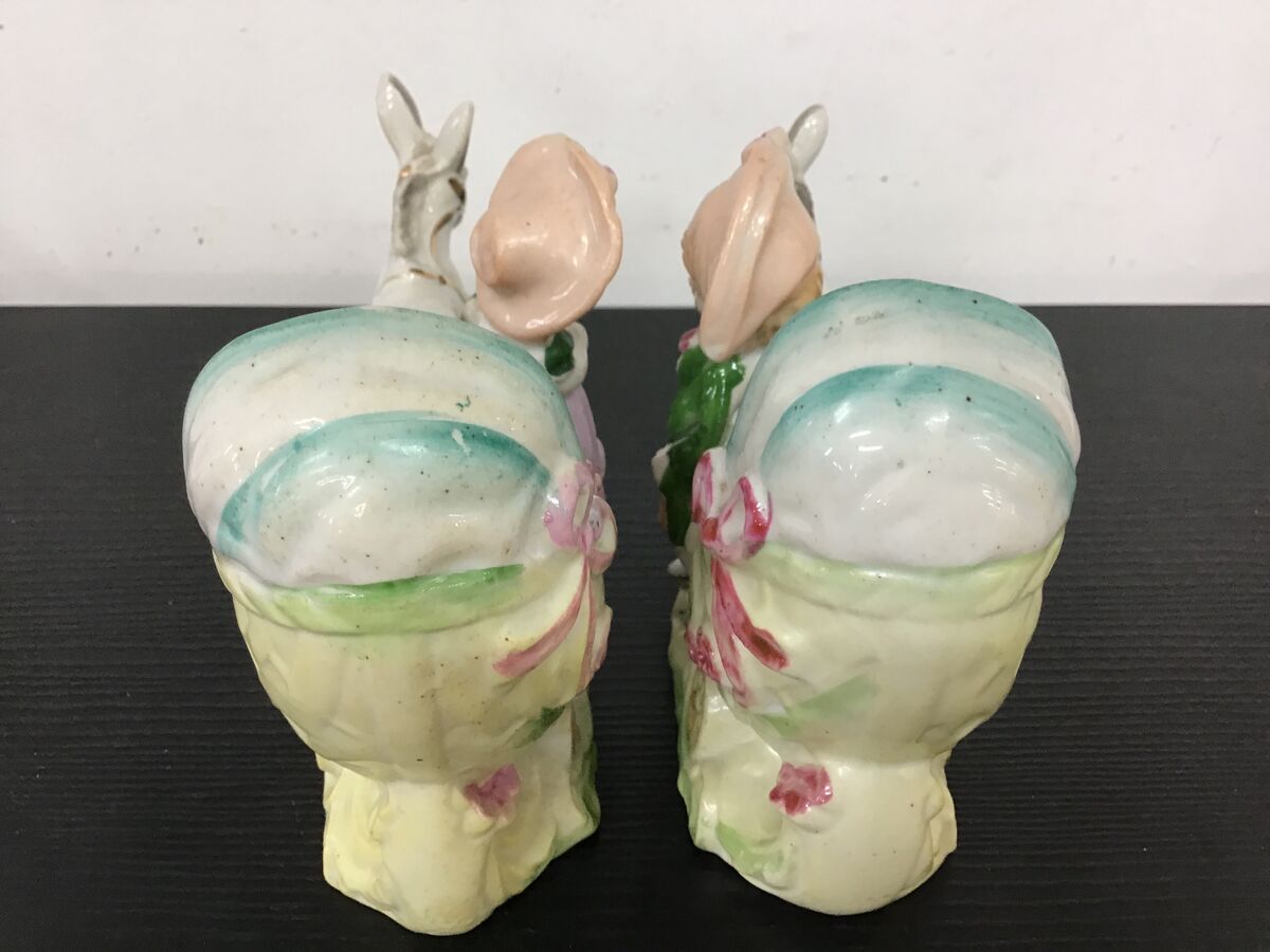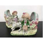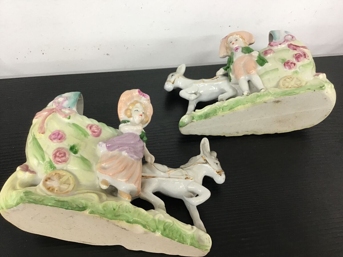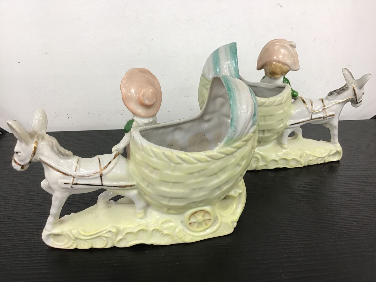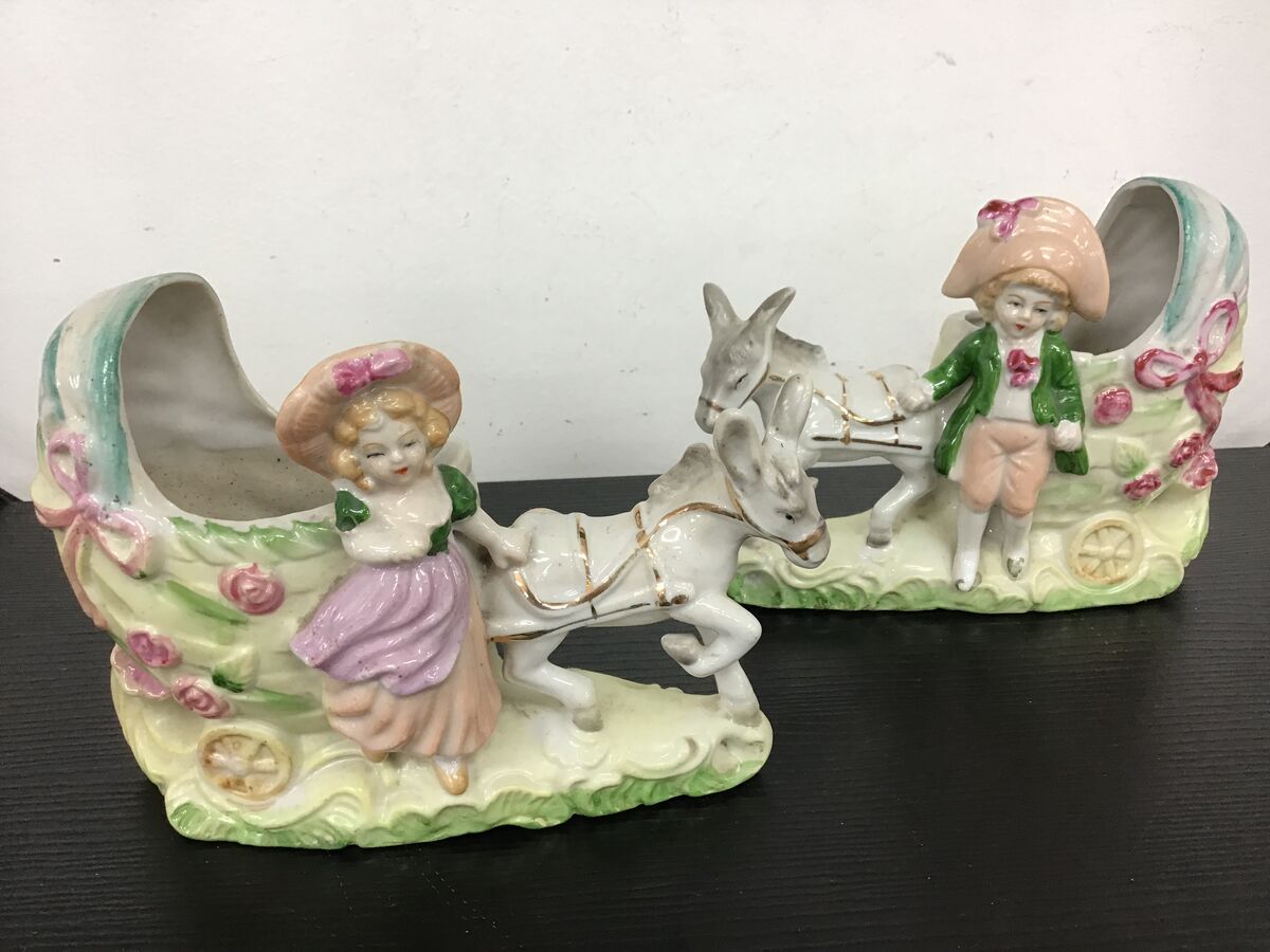 Two matching vintage planters - a boy and girl with a carriage pulling donkey.