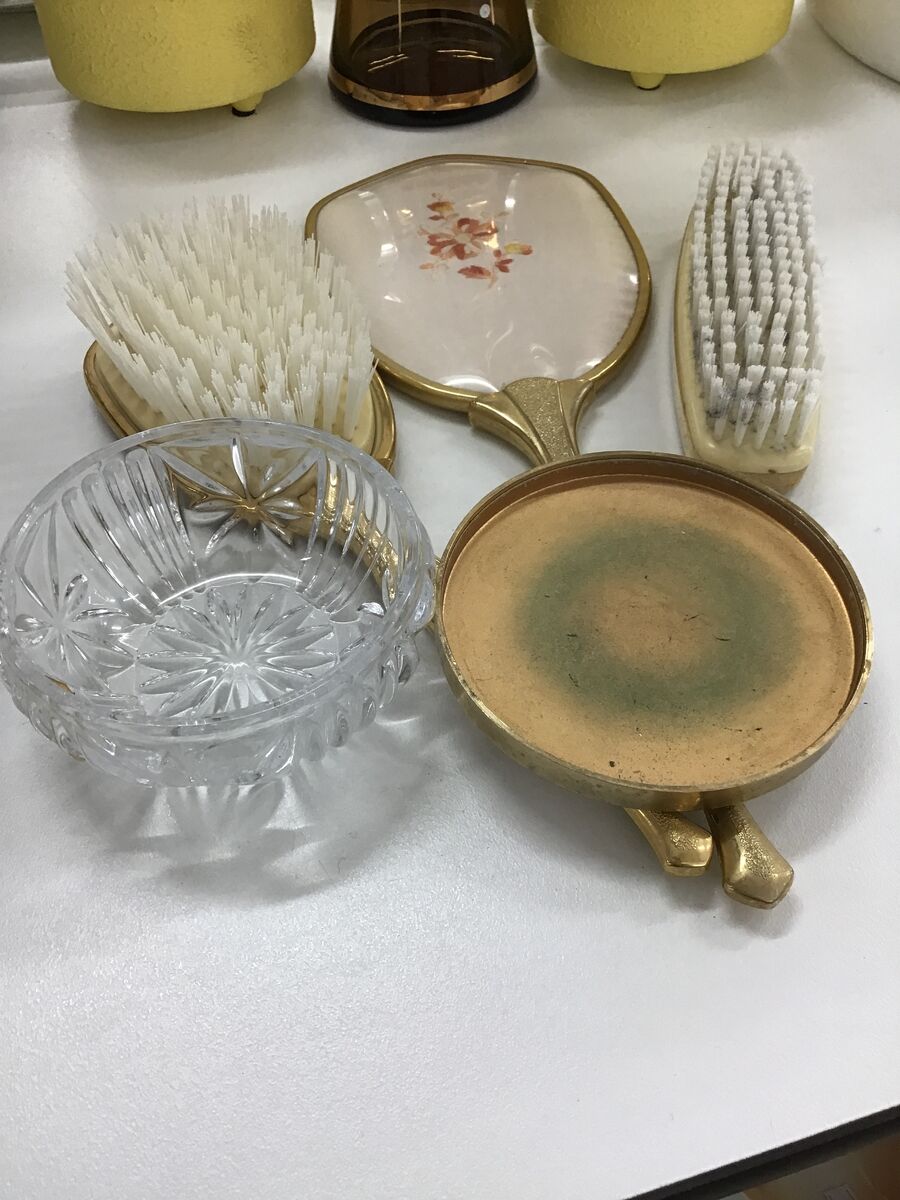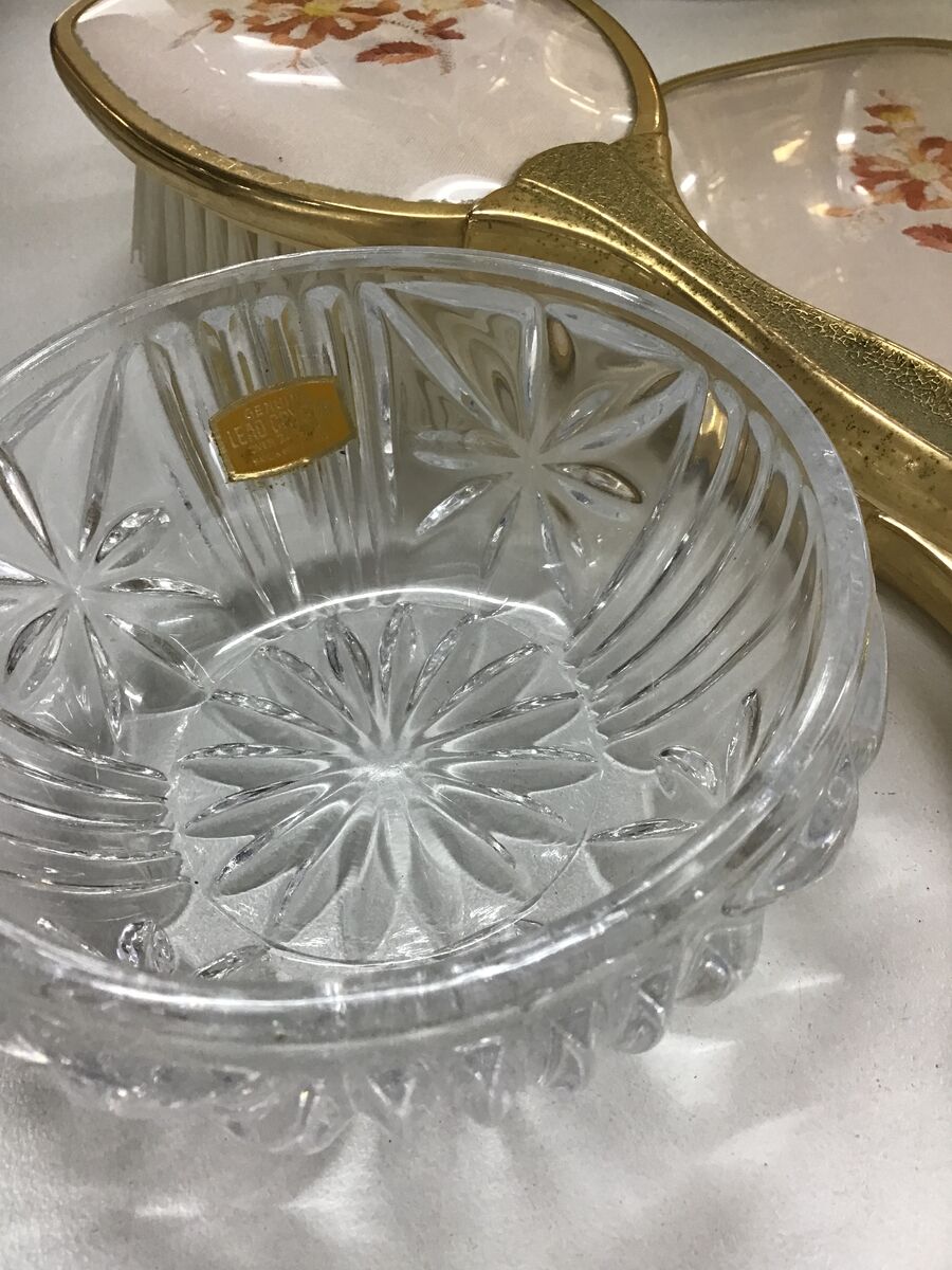 Gold tone metal fram with embroidered design under acetate plastic. Trinket dish has a lead crystal base (original sticker label on it).