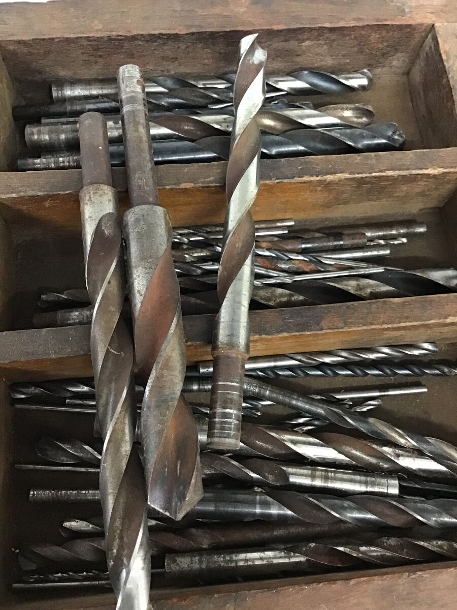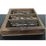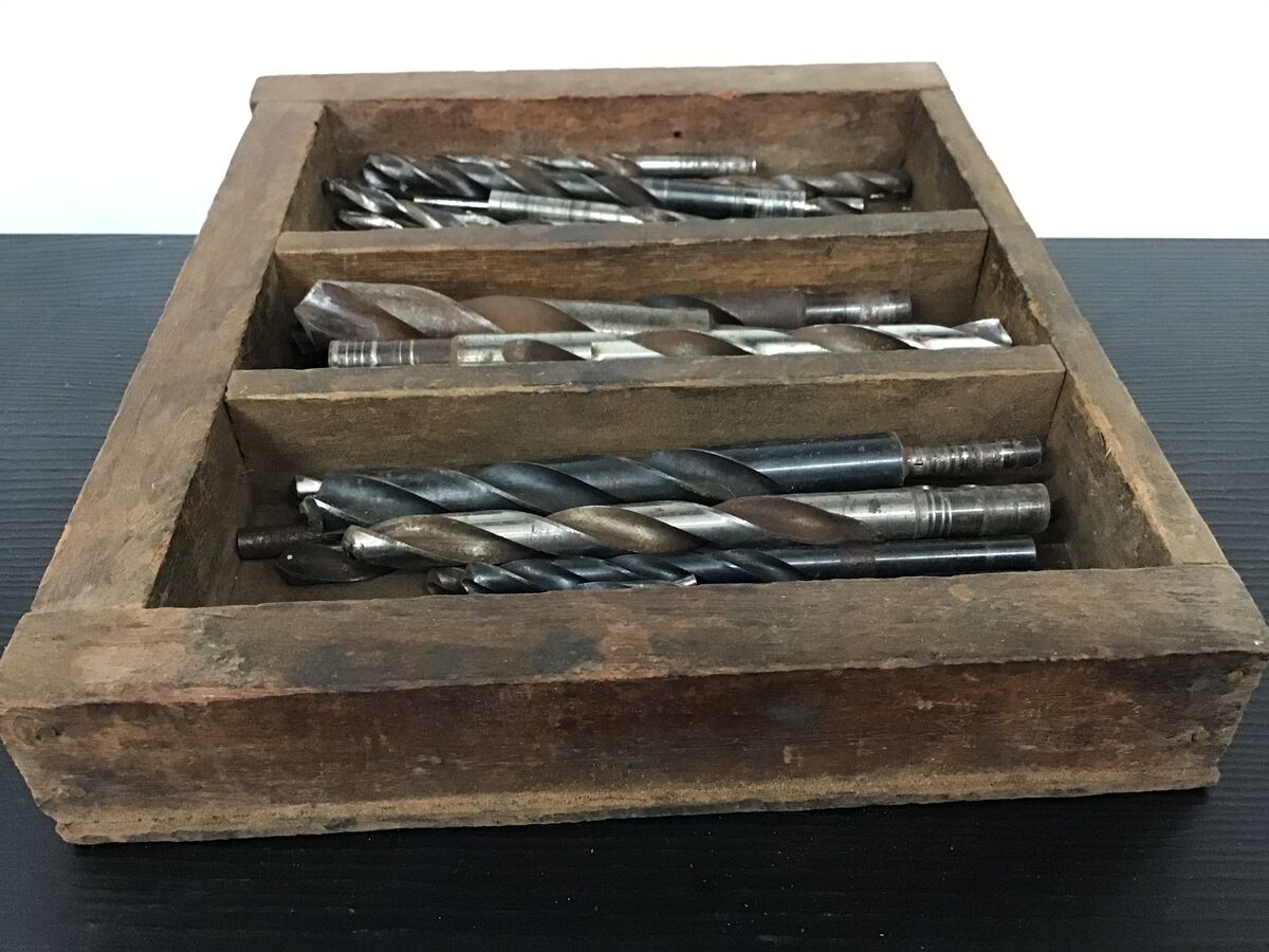 Handmade wooden storage box and a bulk lot of old drill bits - over 30, little to large!