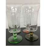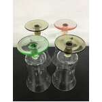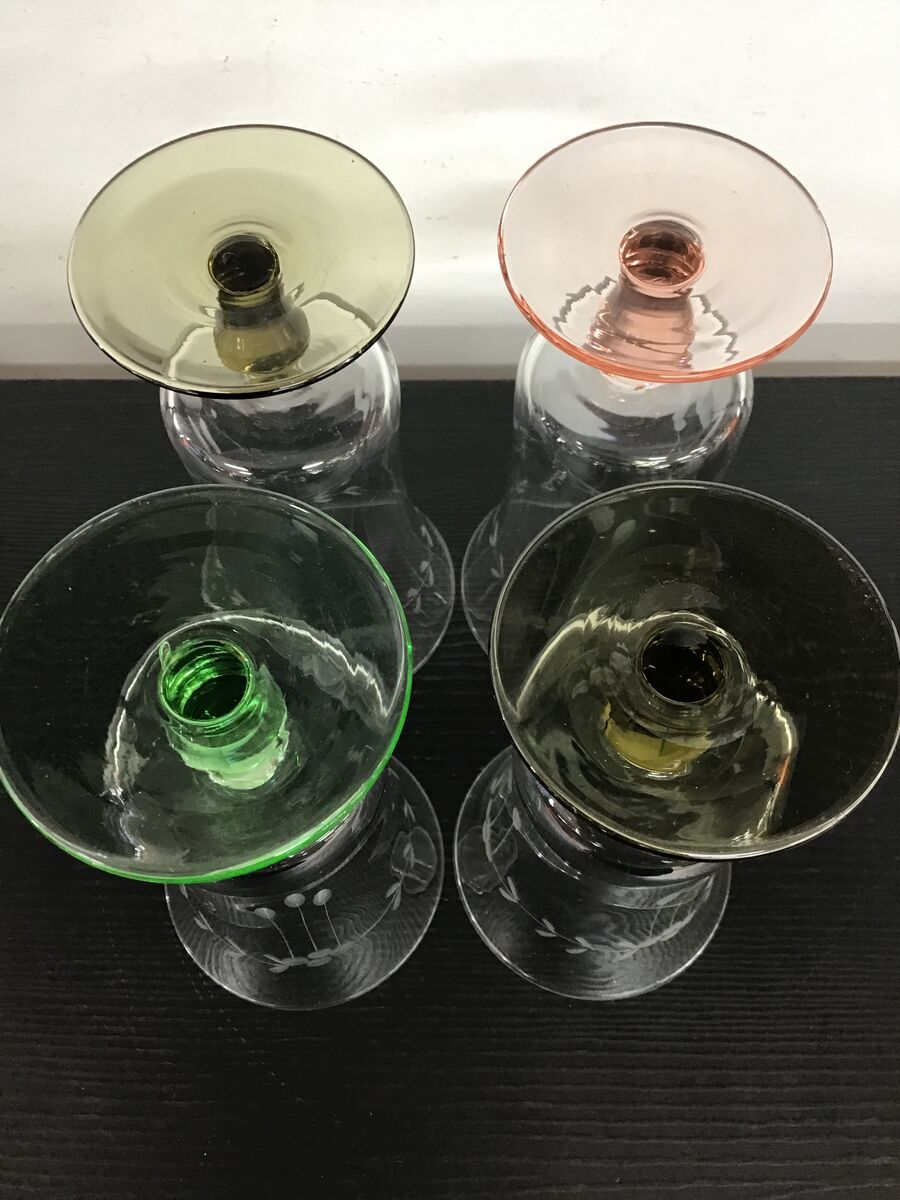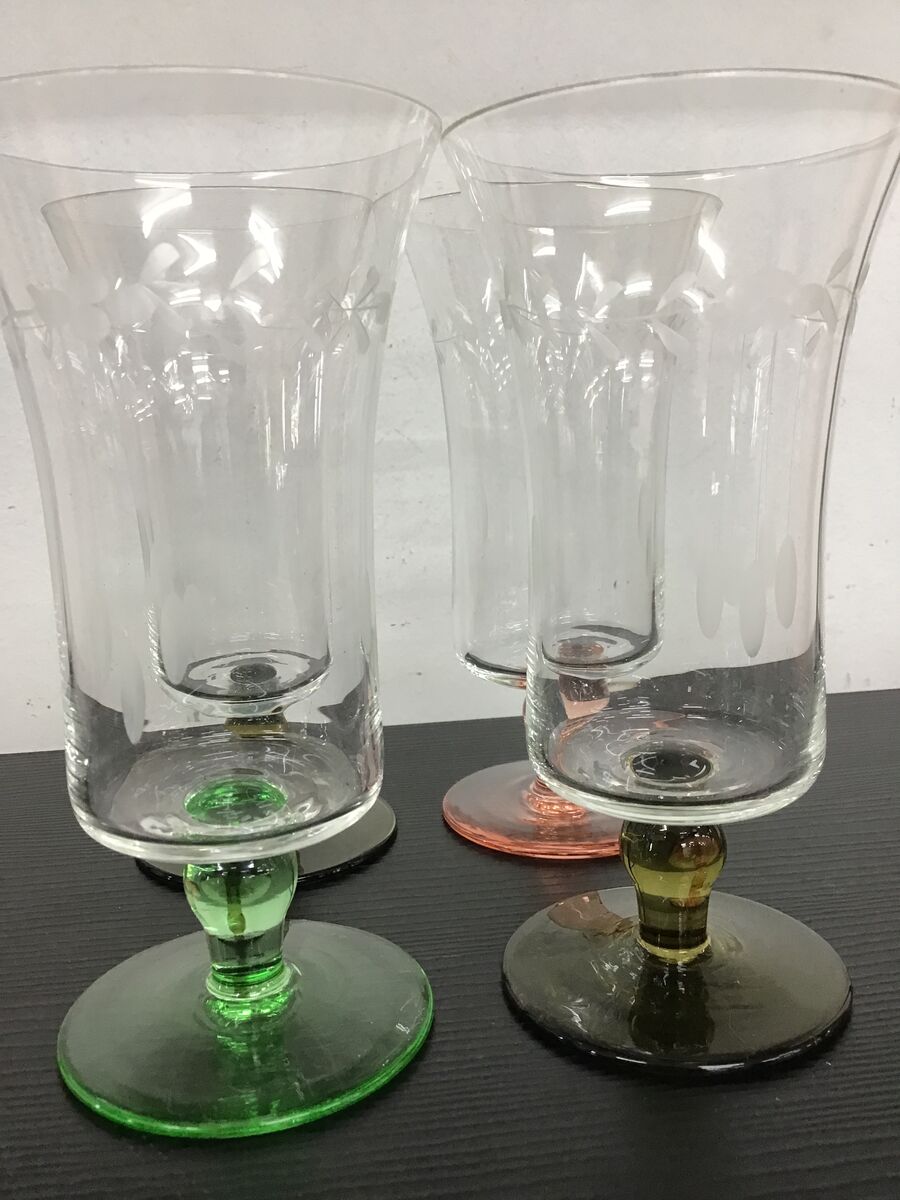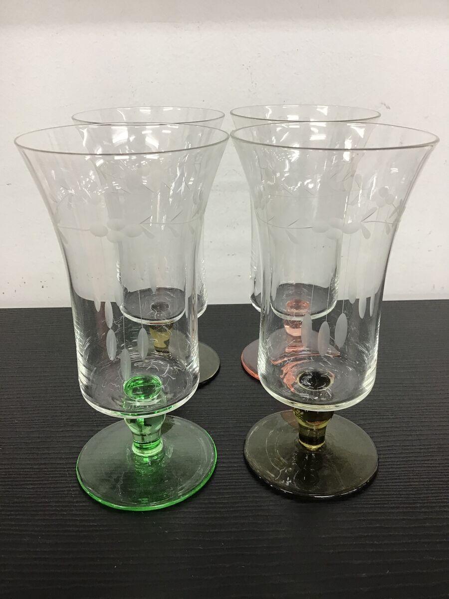Lot of 4 vintage drinking glasses - coloured bases and stems ( 2 x olive, 1 x green, 1 x pink) and a clear body with etched detail.