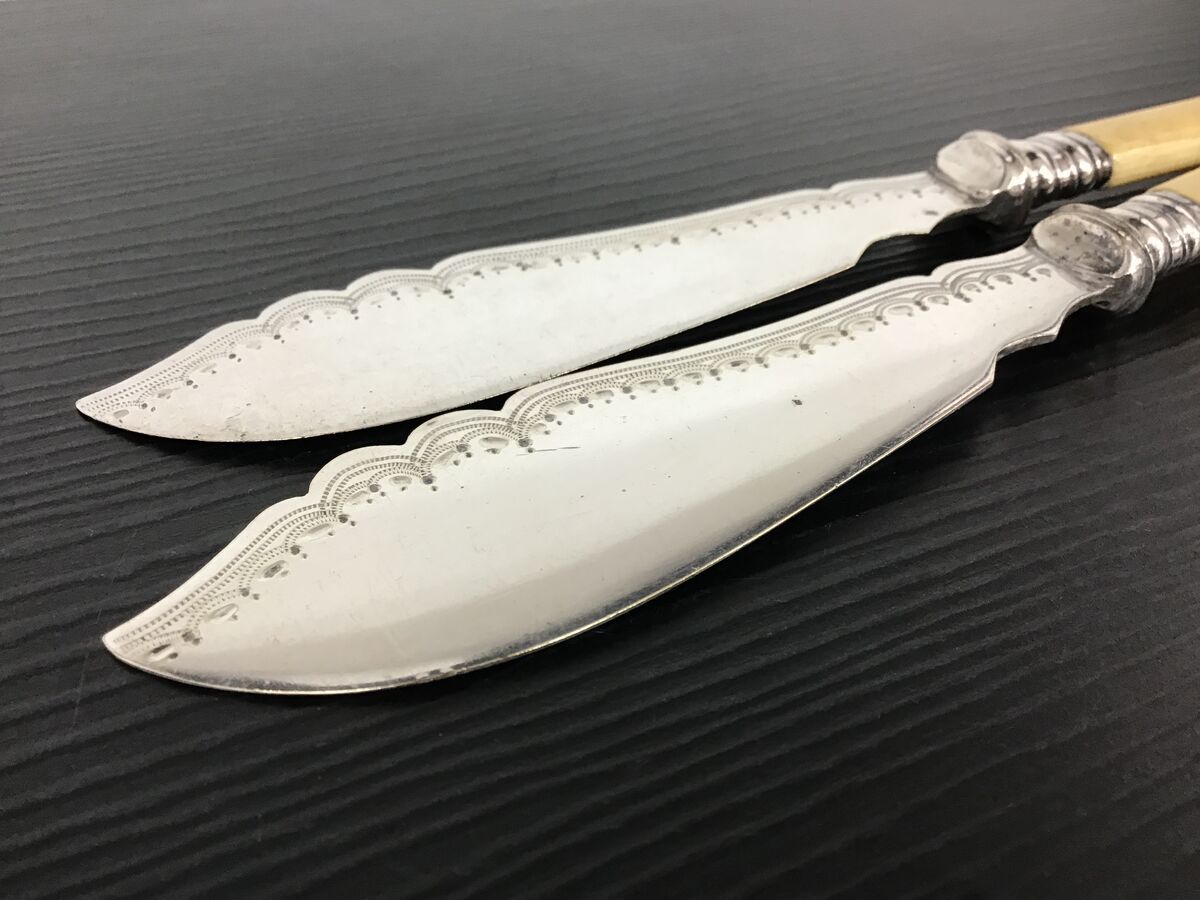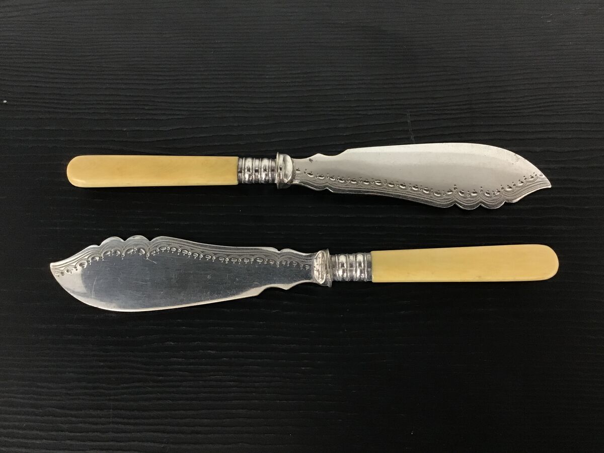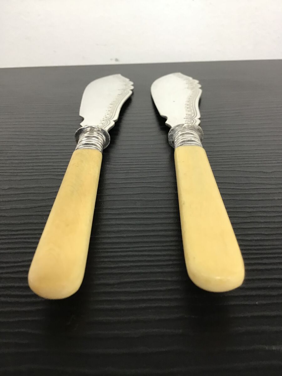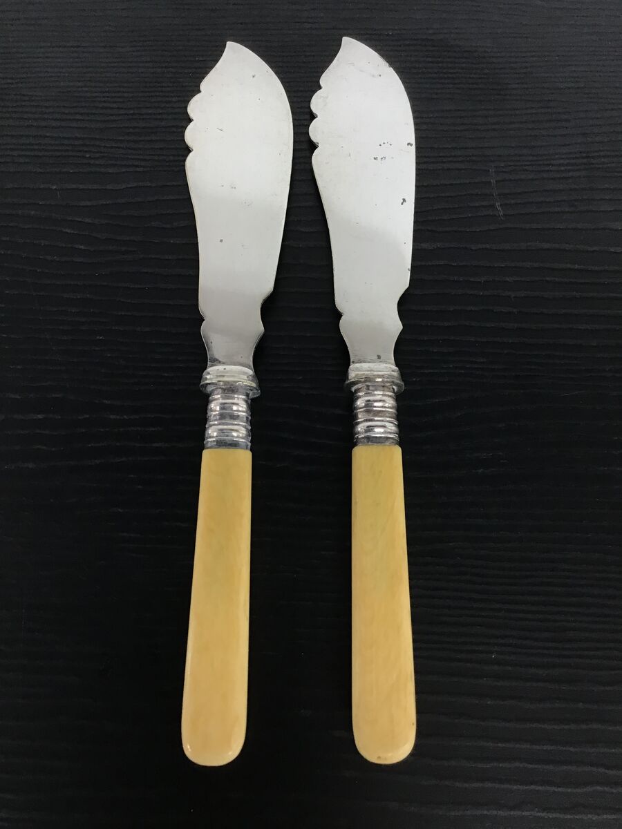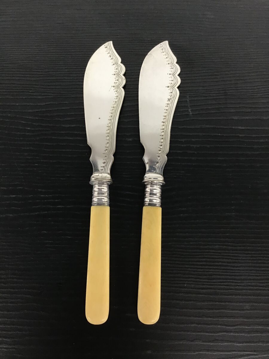 Two vintage faux bone handled fish knives with etched blades.