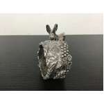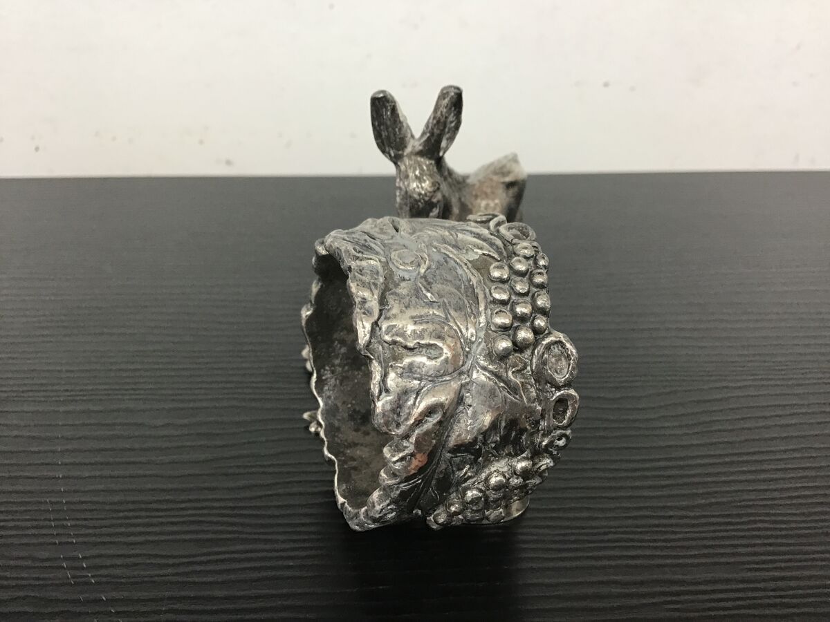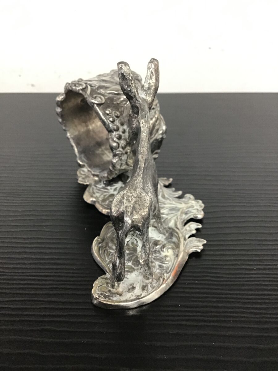 Vintage figural napkin ring featuring a donkey on an ornate base and a napkin ring styled to look like a grape vine.