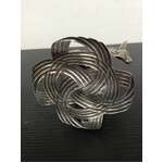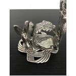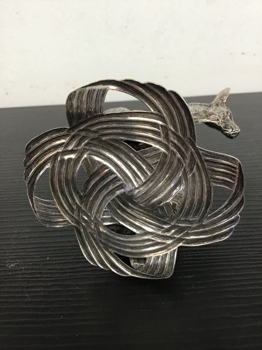 Vintage figural napkin ring featuring a donkey and plam tree on a woven knot base.