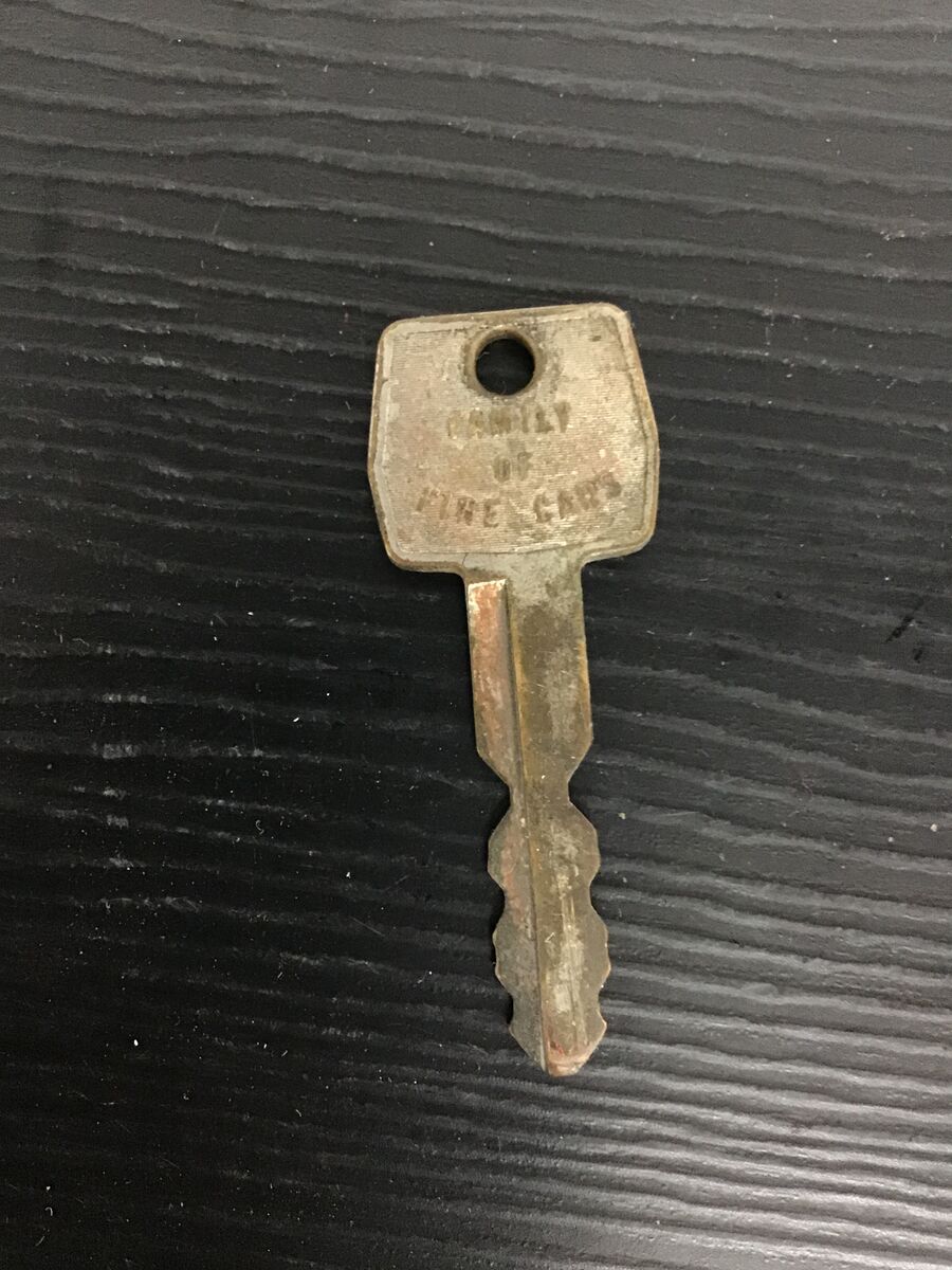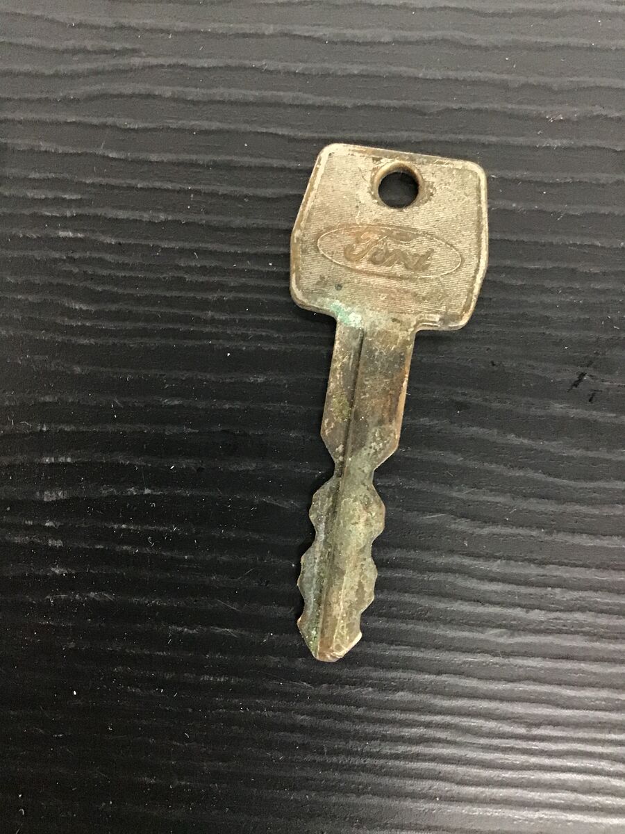 Old car key bearing the Ford logo on one side of the key head and the slogan 'Family of Finest Cars' on the other.