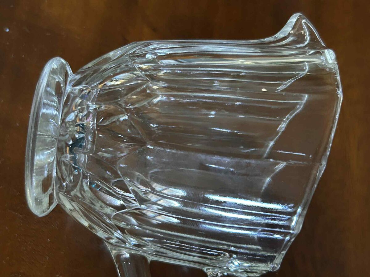 Small clear glass creamer jug - ribbed sides and flower-shaped pattern on base.
