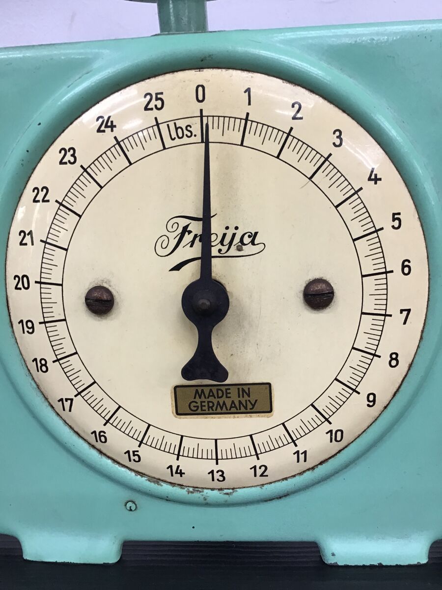 In good working order but does not have the original weighing pan (easy enough to pop a bowl on top and adjust the dial to tare). Some age wear and cosmetic marks, as pictured.