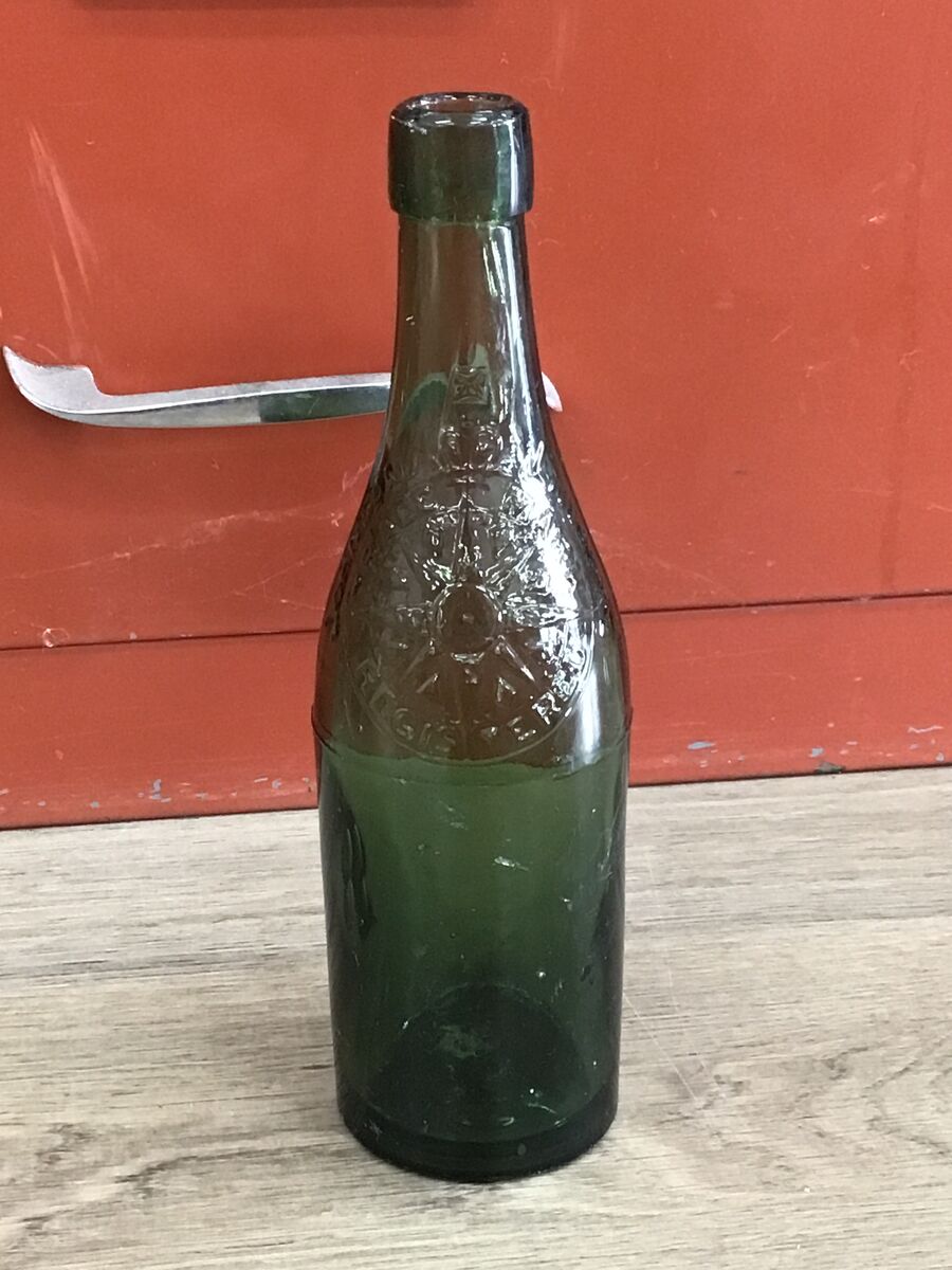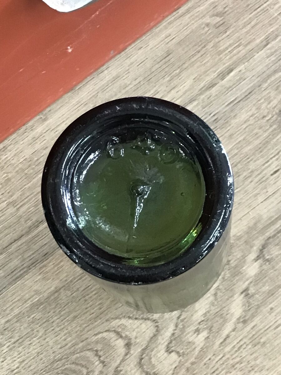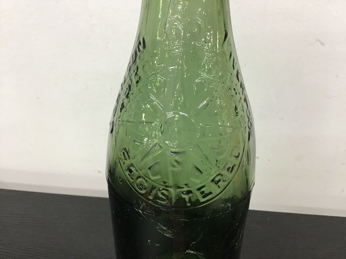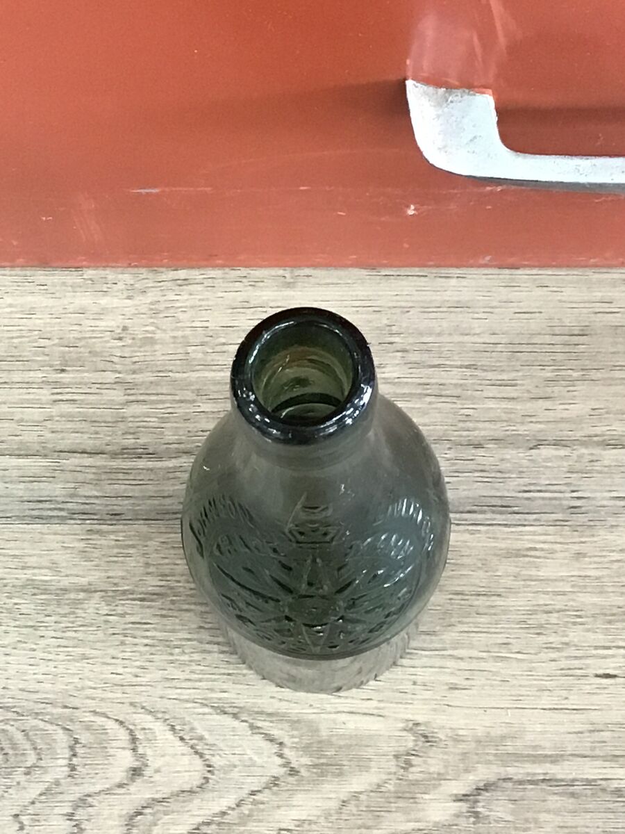 Vintage embossed green glass bottle - labelled Johnson Liverpool with a pictorial crown and compass trademark.