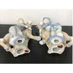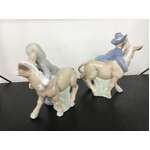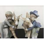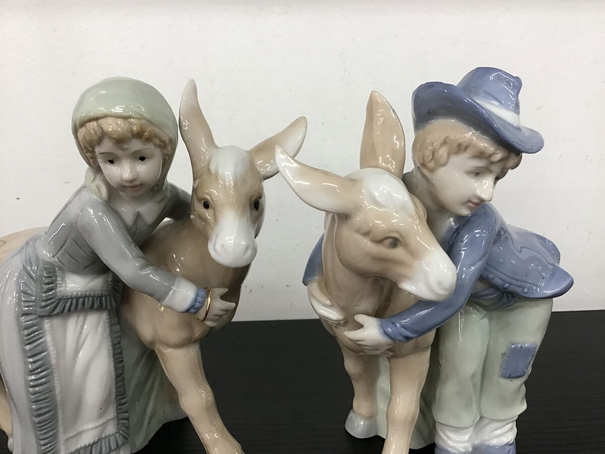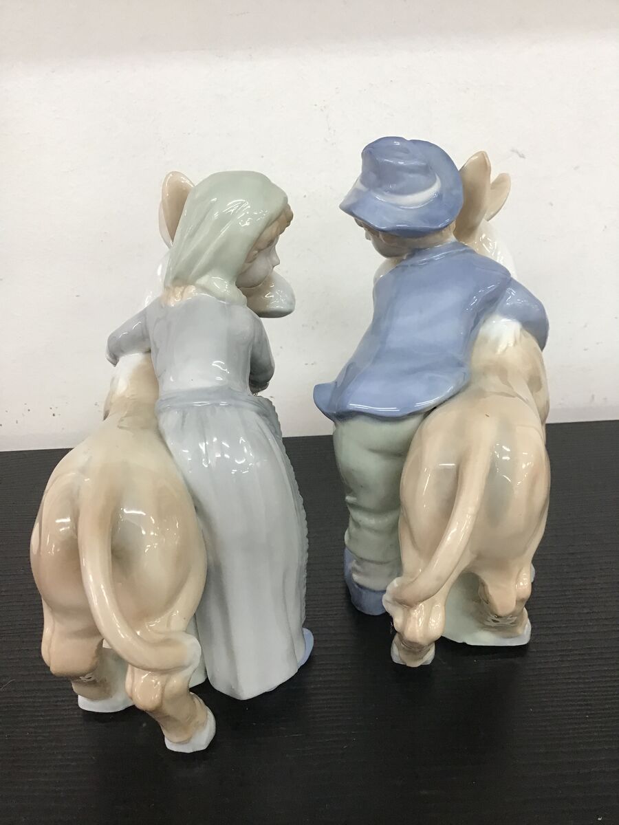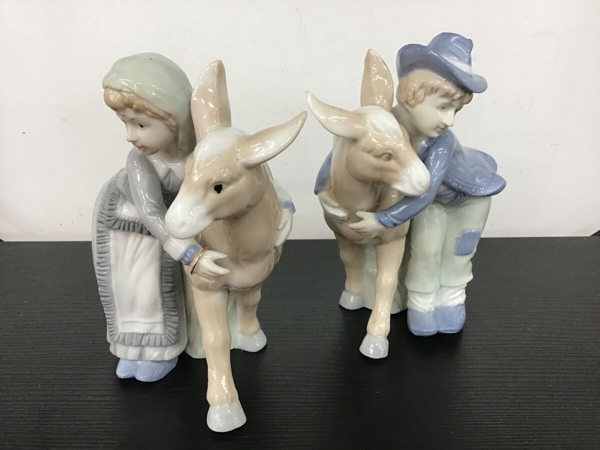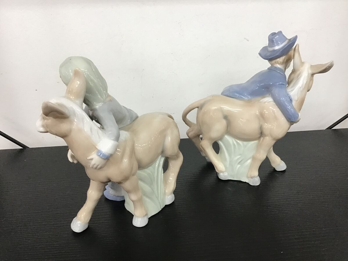 Two vintage porcelain figurines (Lenwile China Ardalt Japan) of a boy and girl hugging a donkey.