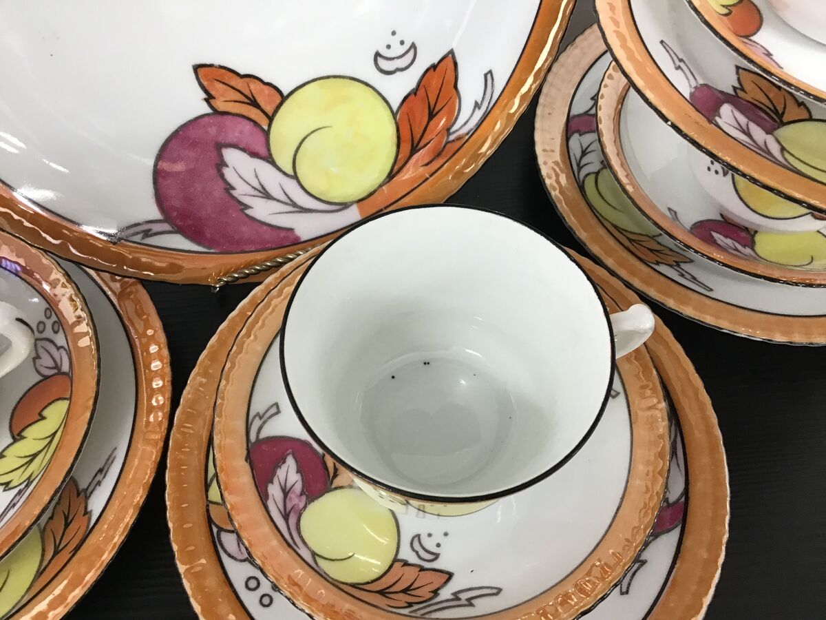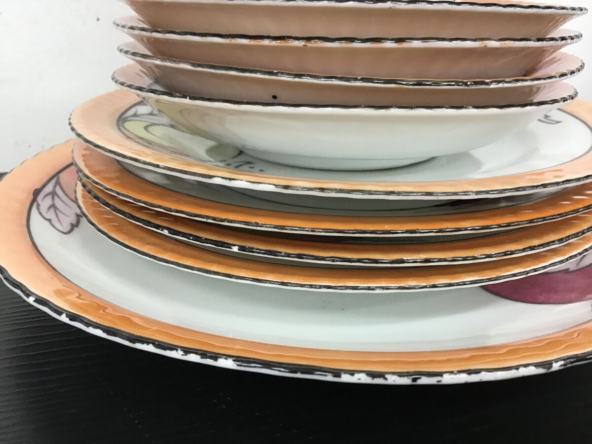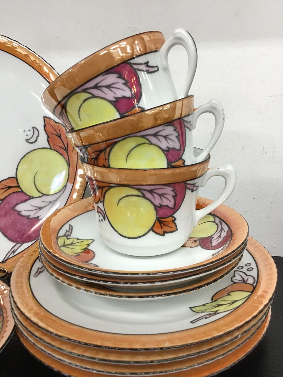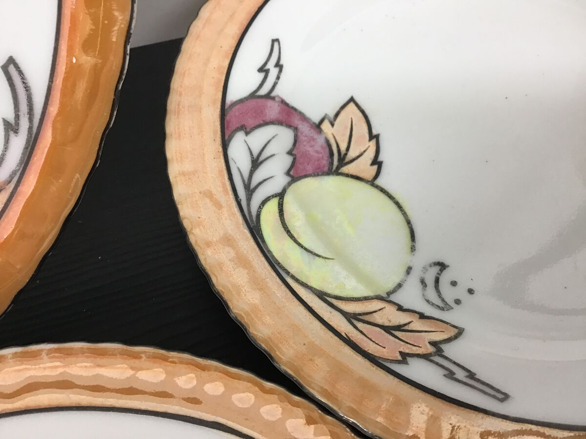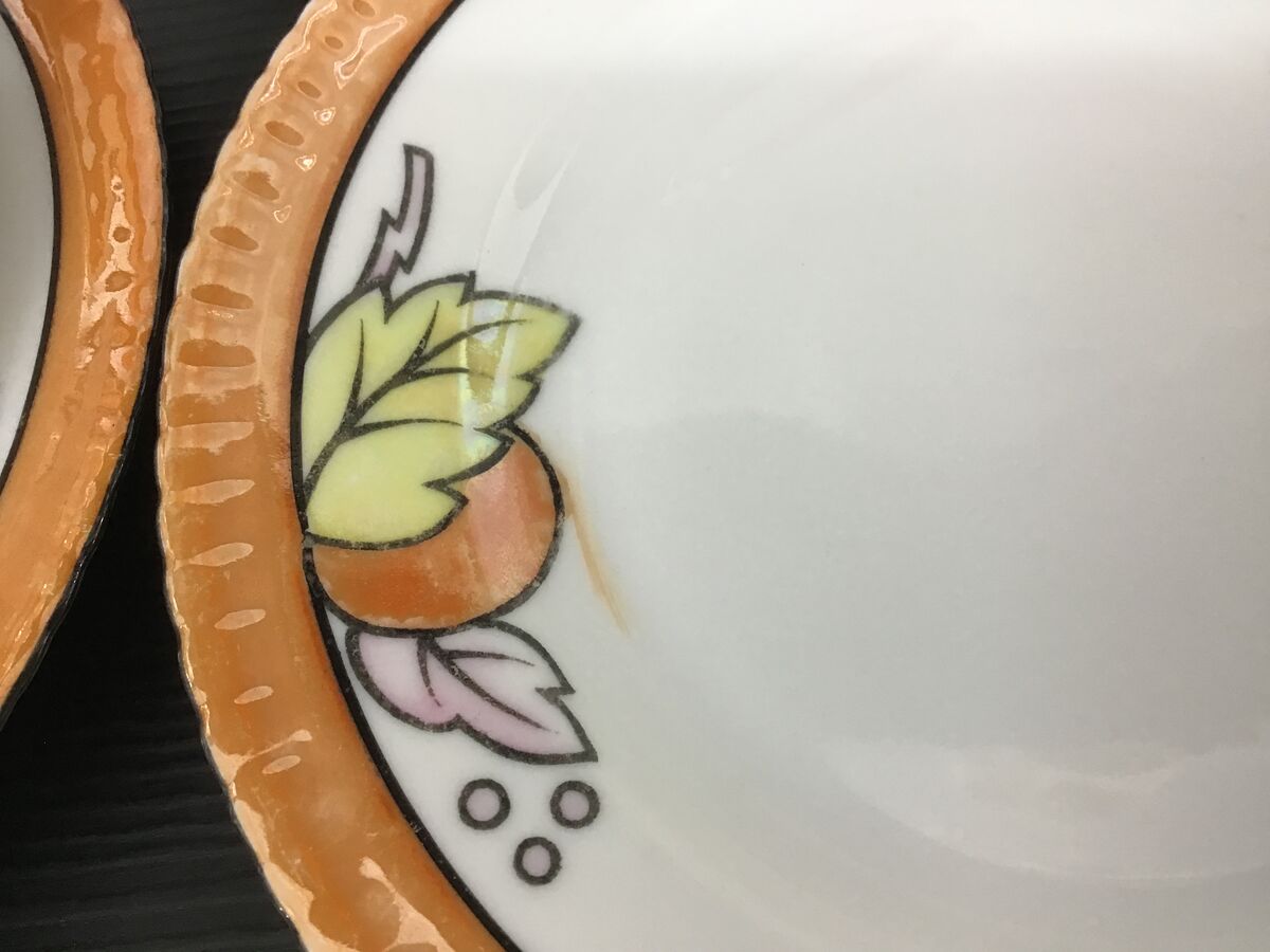 - One side plate has a smear of the lustre glaze outside where it should be on the design