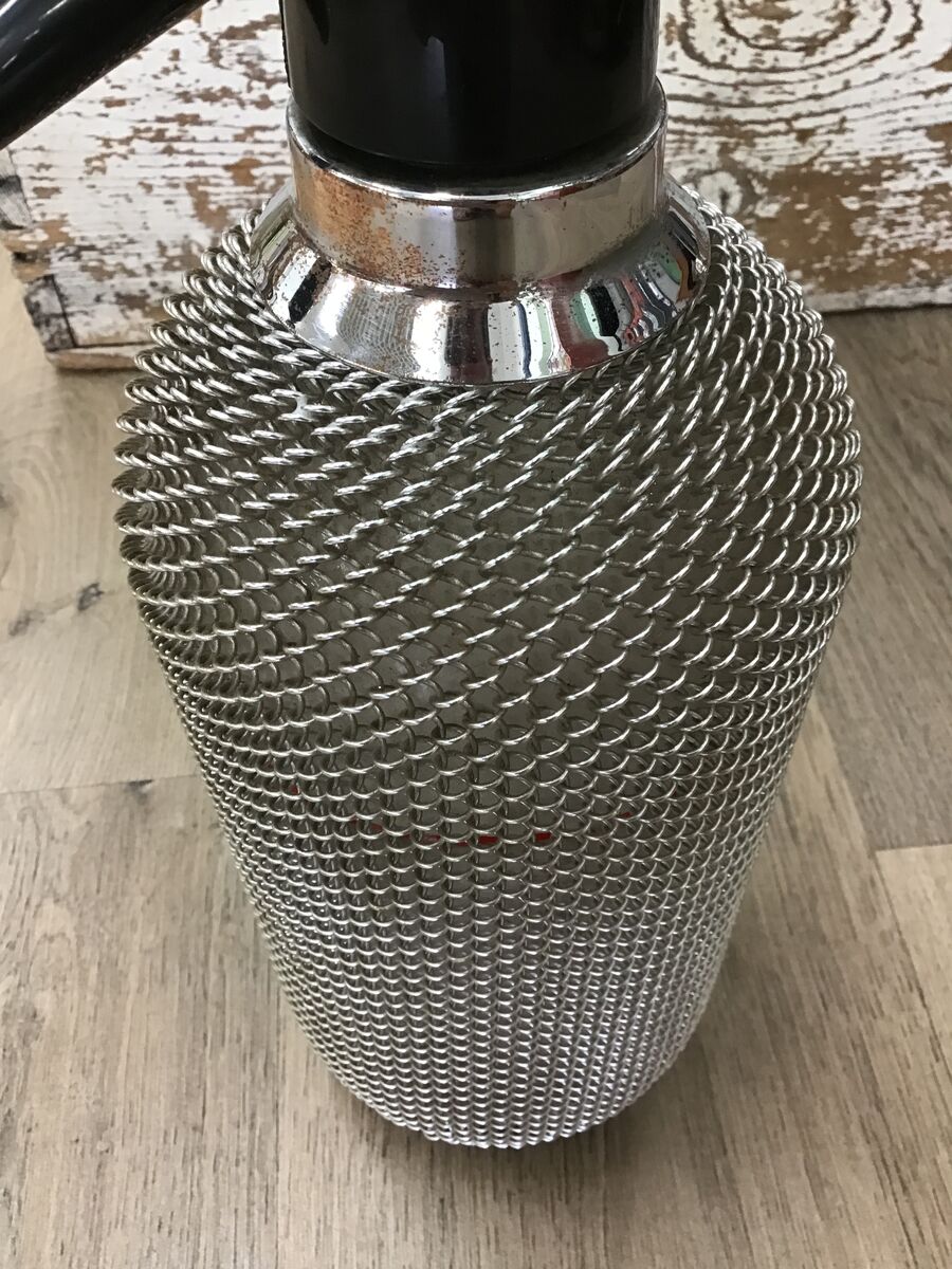 Vintage soda syphon bottle covered in silver mesh.