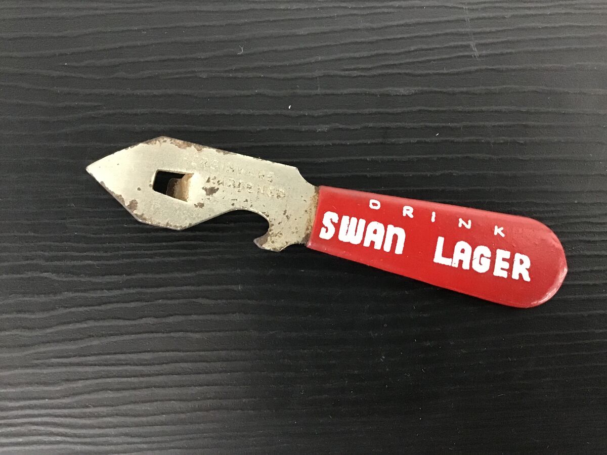 - Metal with a red plastic handle branded 'Drink Swan Lager'
