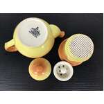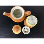13.5 cm tall when stacked together. Bottom pot has a diameter of 9 cm and is 15 cm wide including spout.