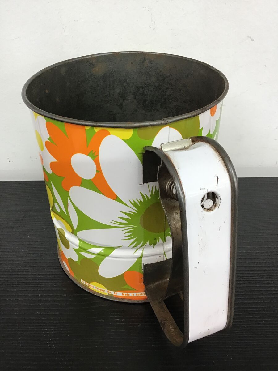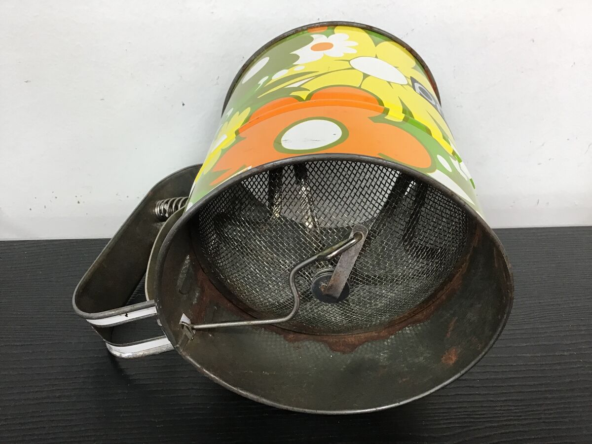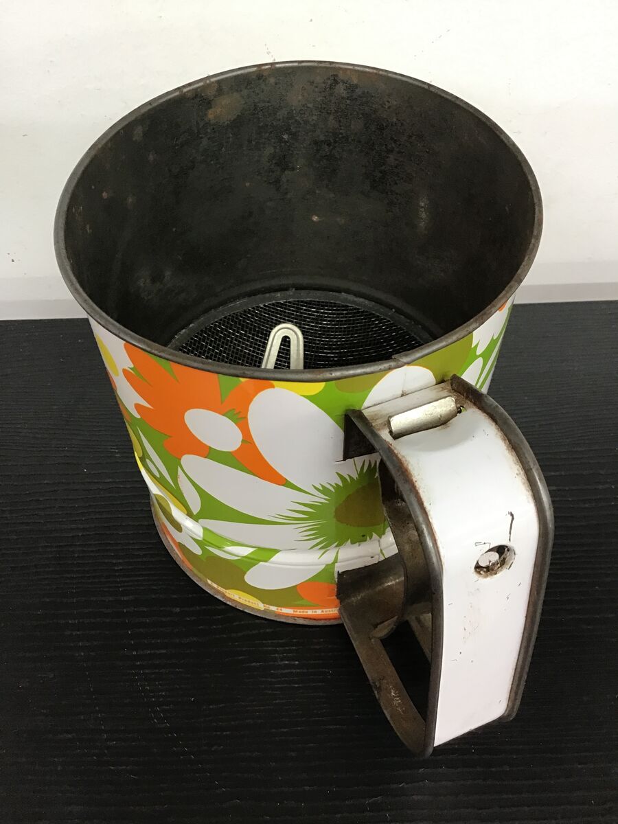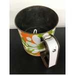 Retro flour sifter with a bright flower power pattern: