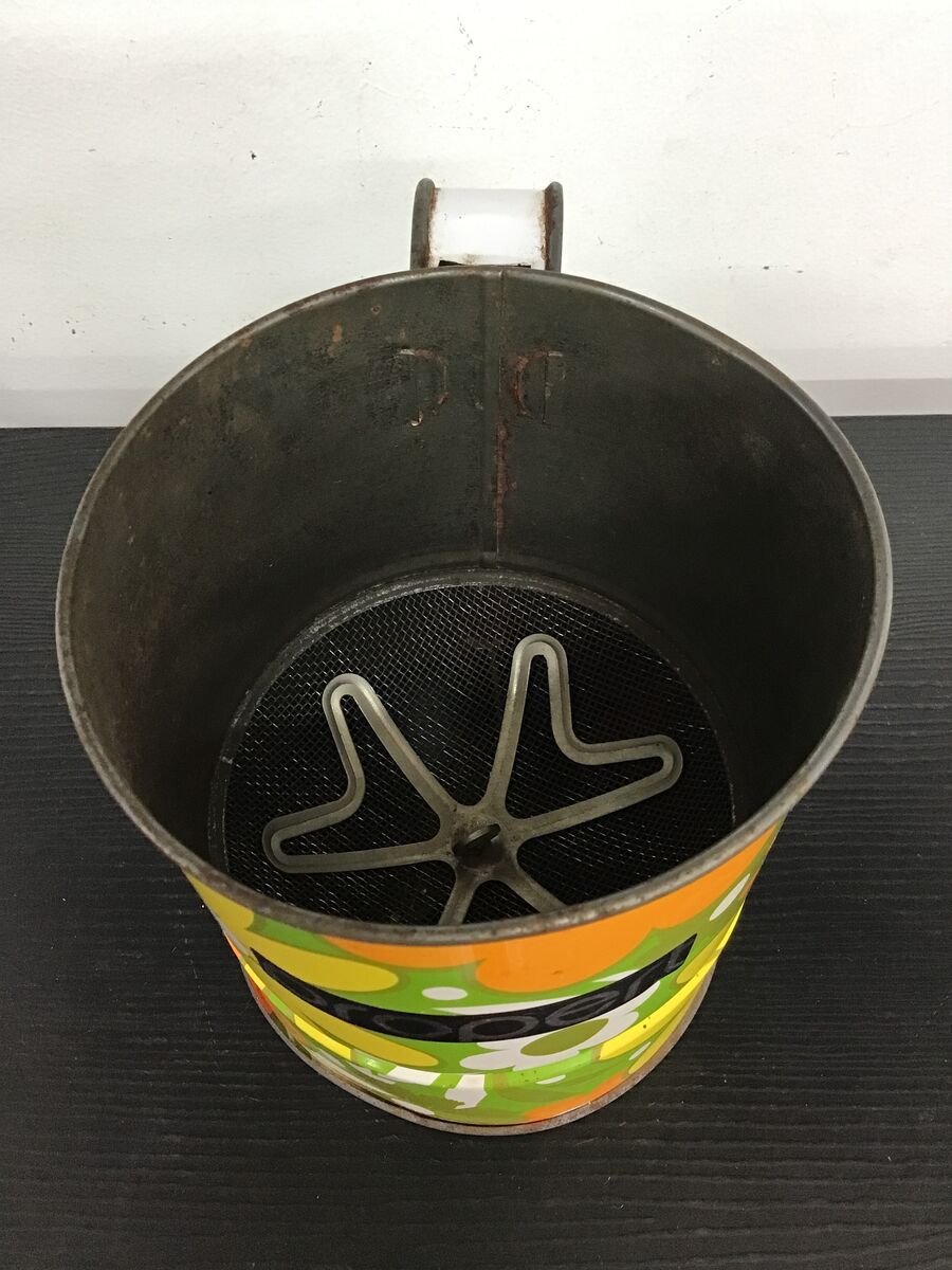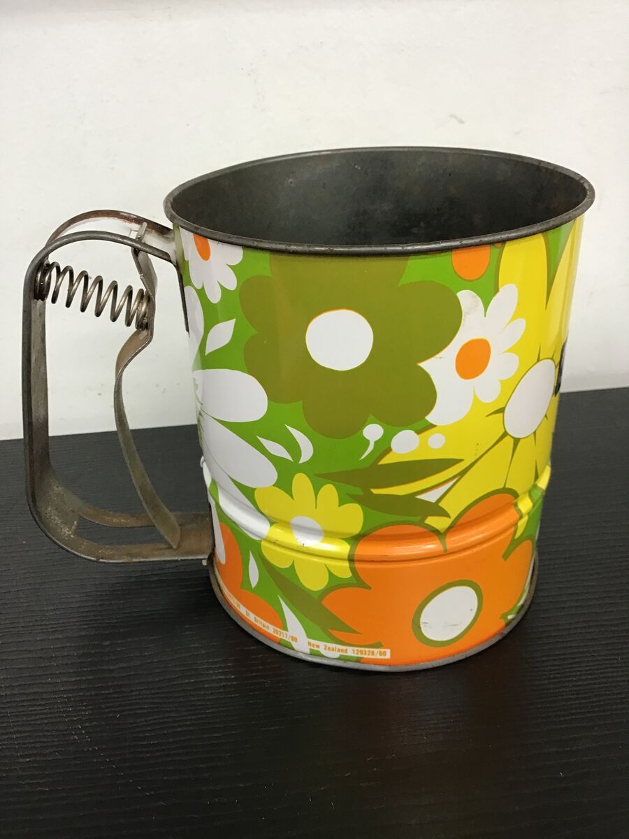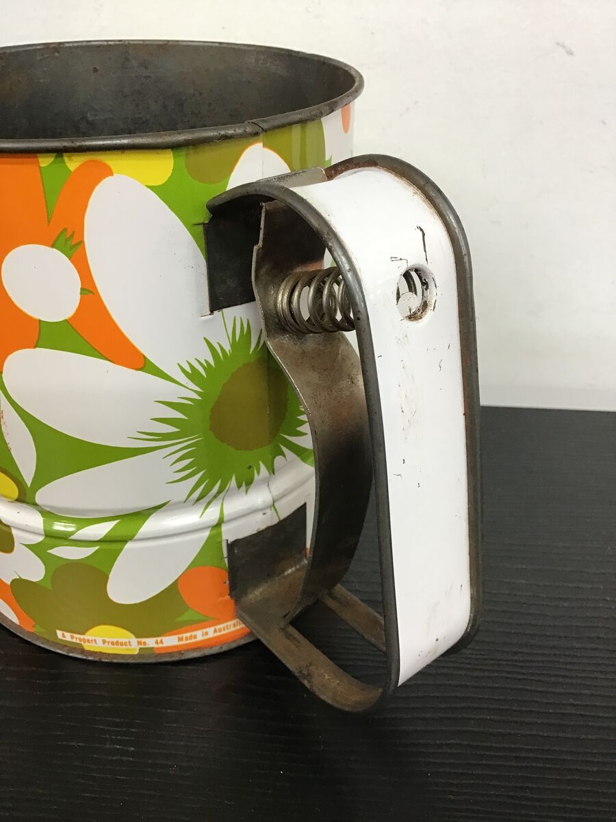 Retro flour sifter with a bright flower power pattern: