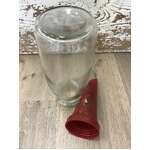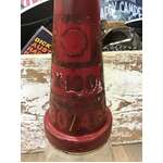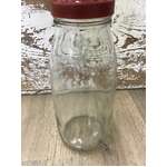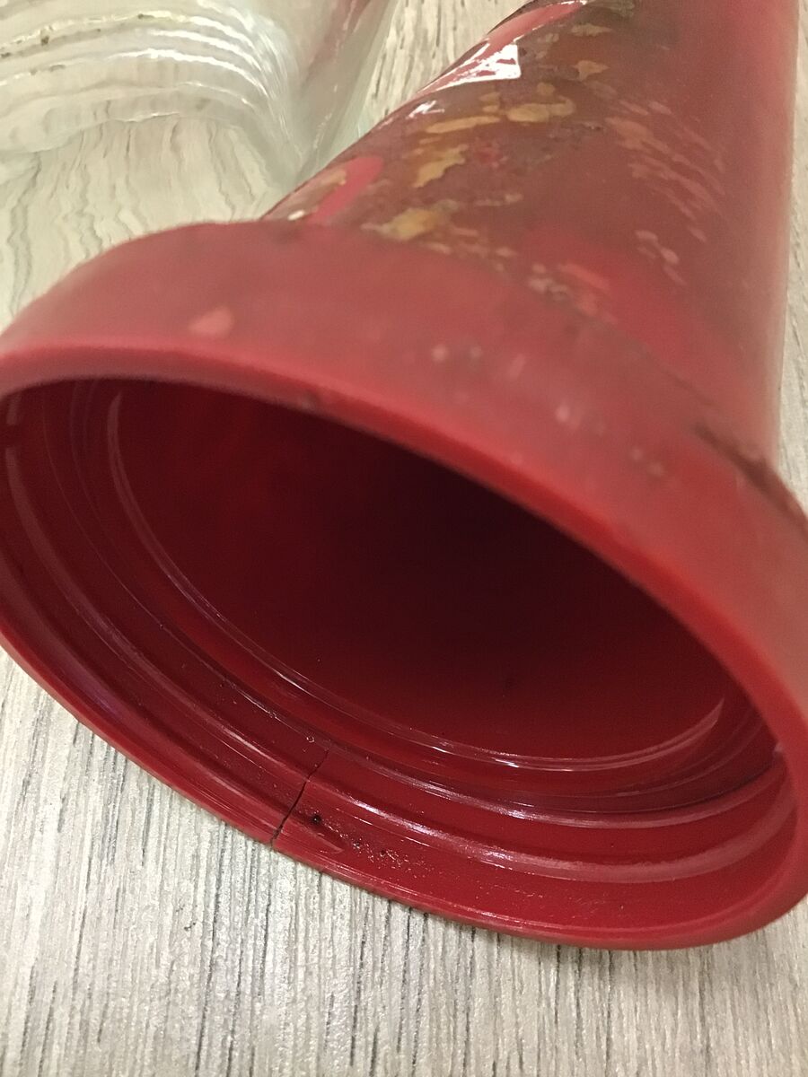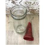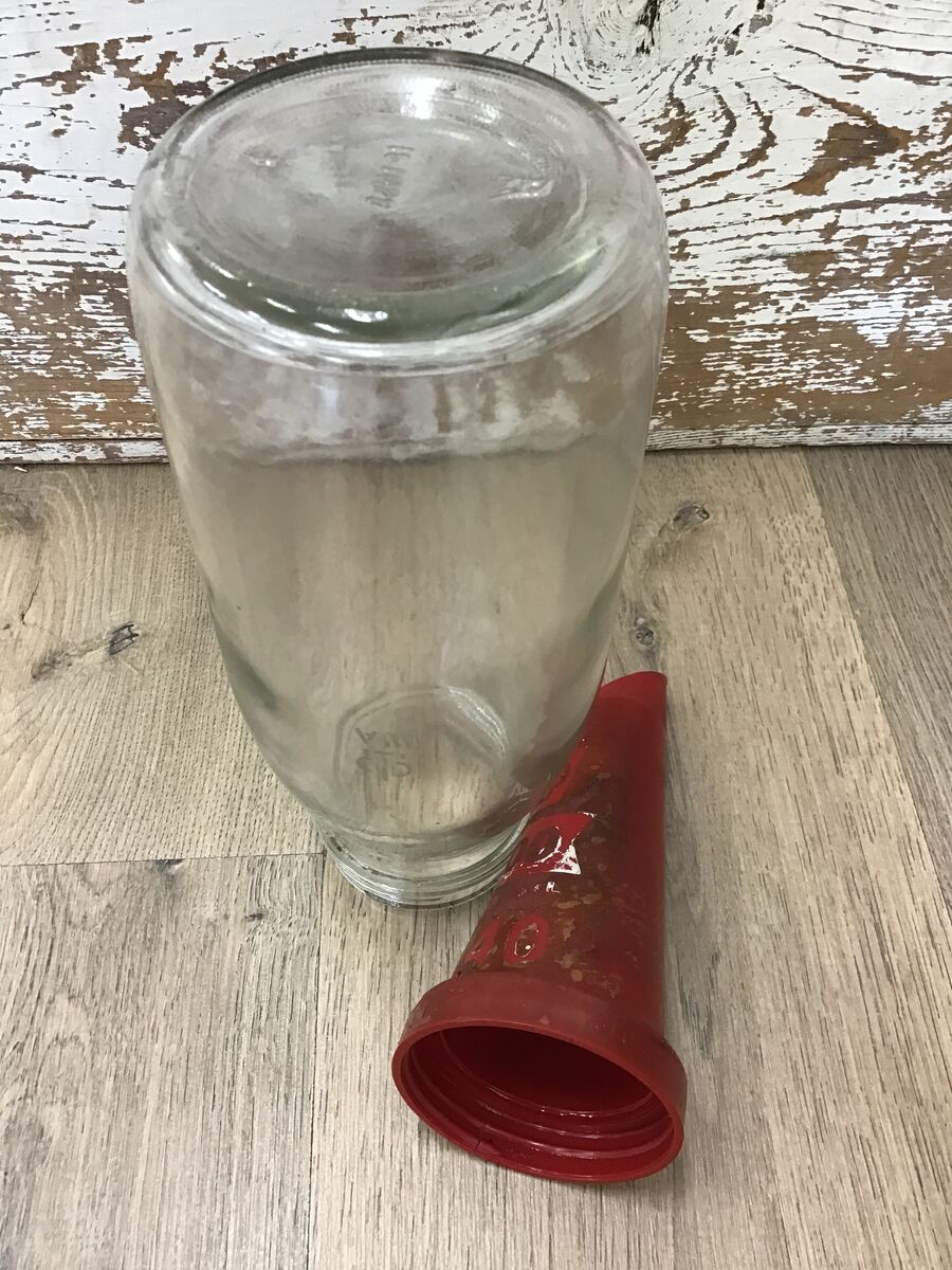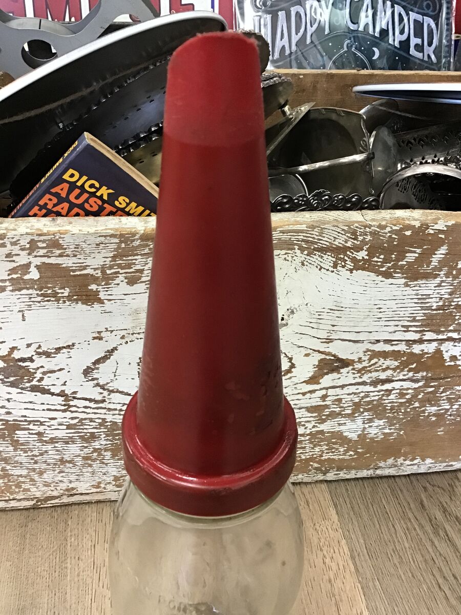 Vintage 1 quart glass oil bottle with red plastic pourer (no dust cap).