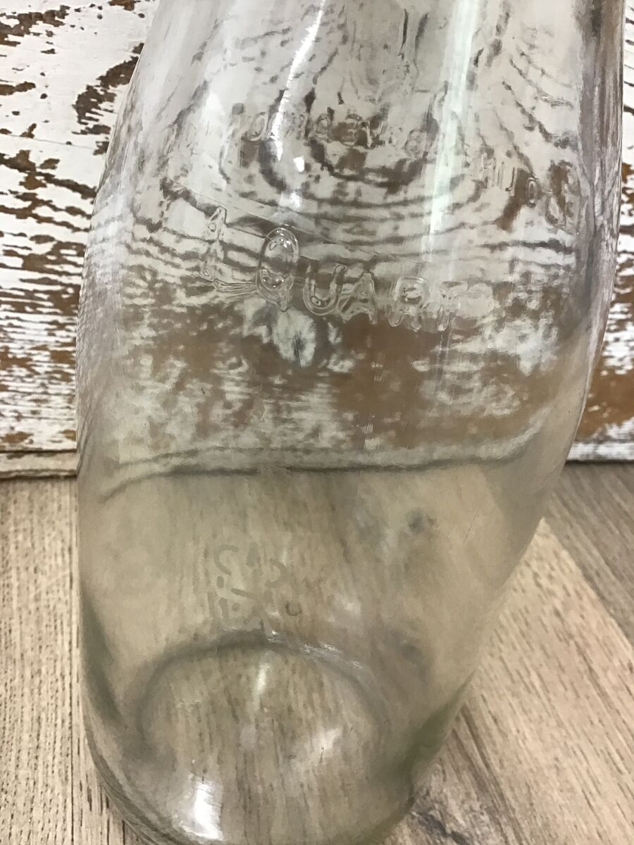- Glass oil bottle has an acid etched WA mark and embossed labelling '1 Quart' and 'fill to line above arrow point'