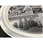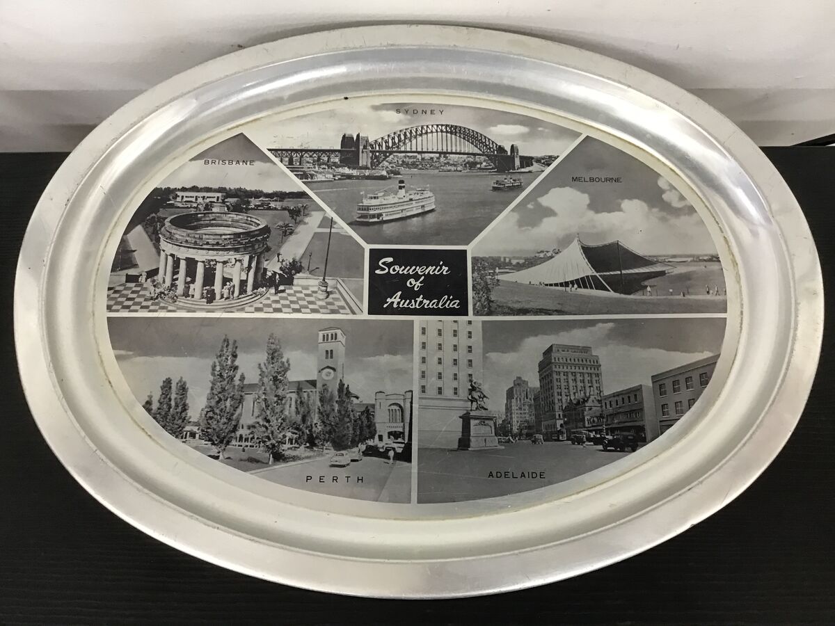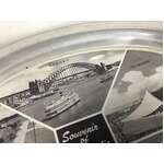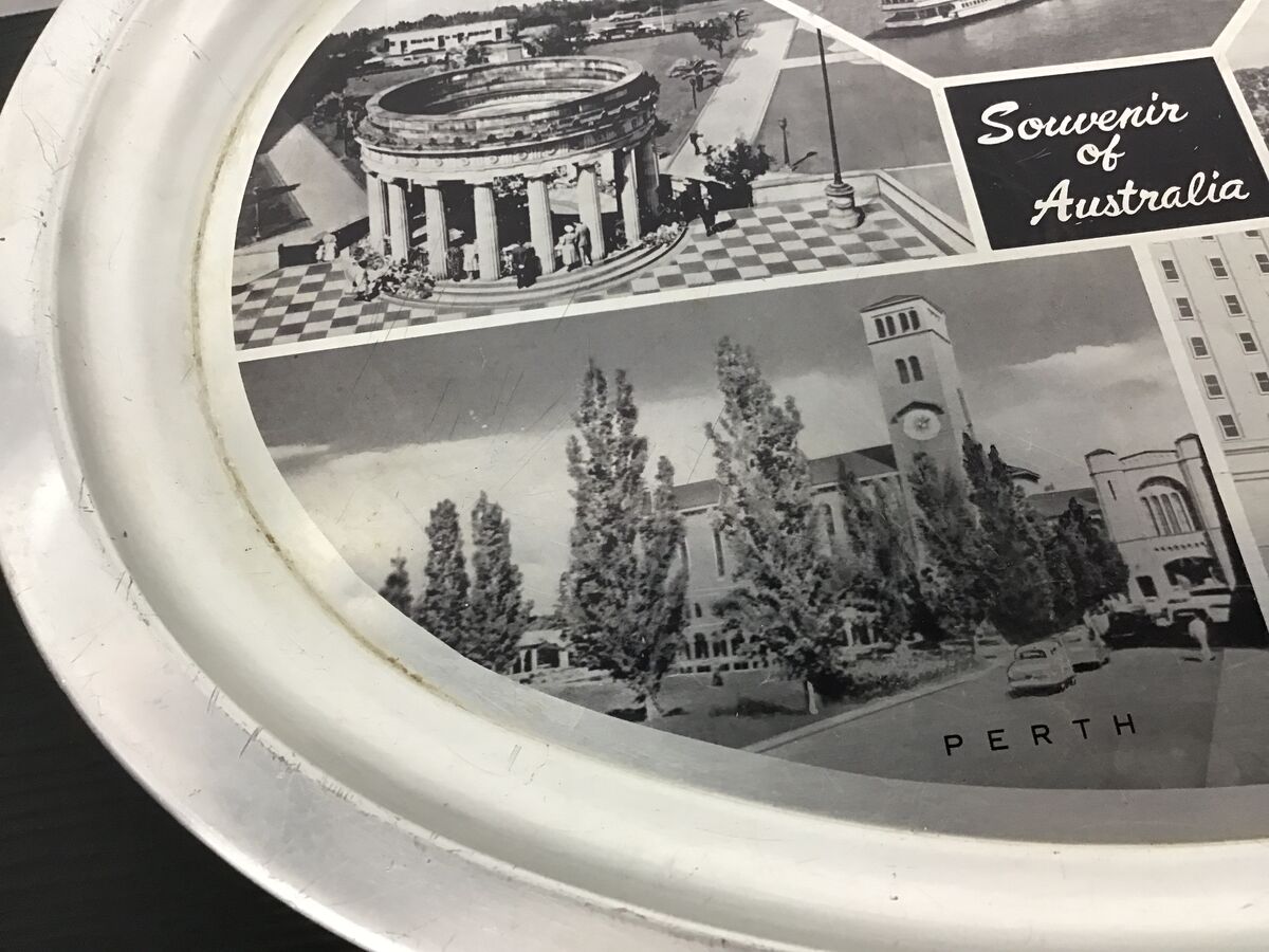 Oval souvenir drinks tray from Australia - featuring black and white images of Perth, Sydney, Melbourne, Brisbane and Adelaide.