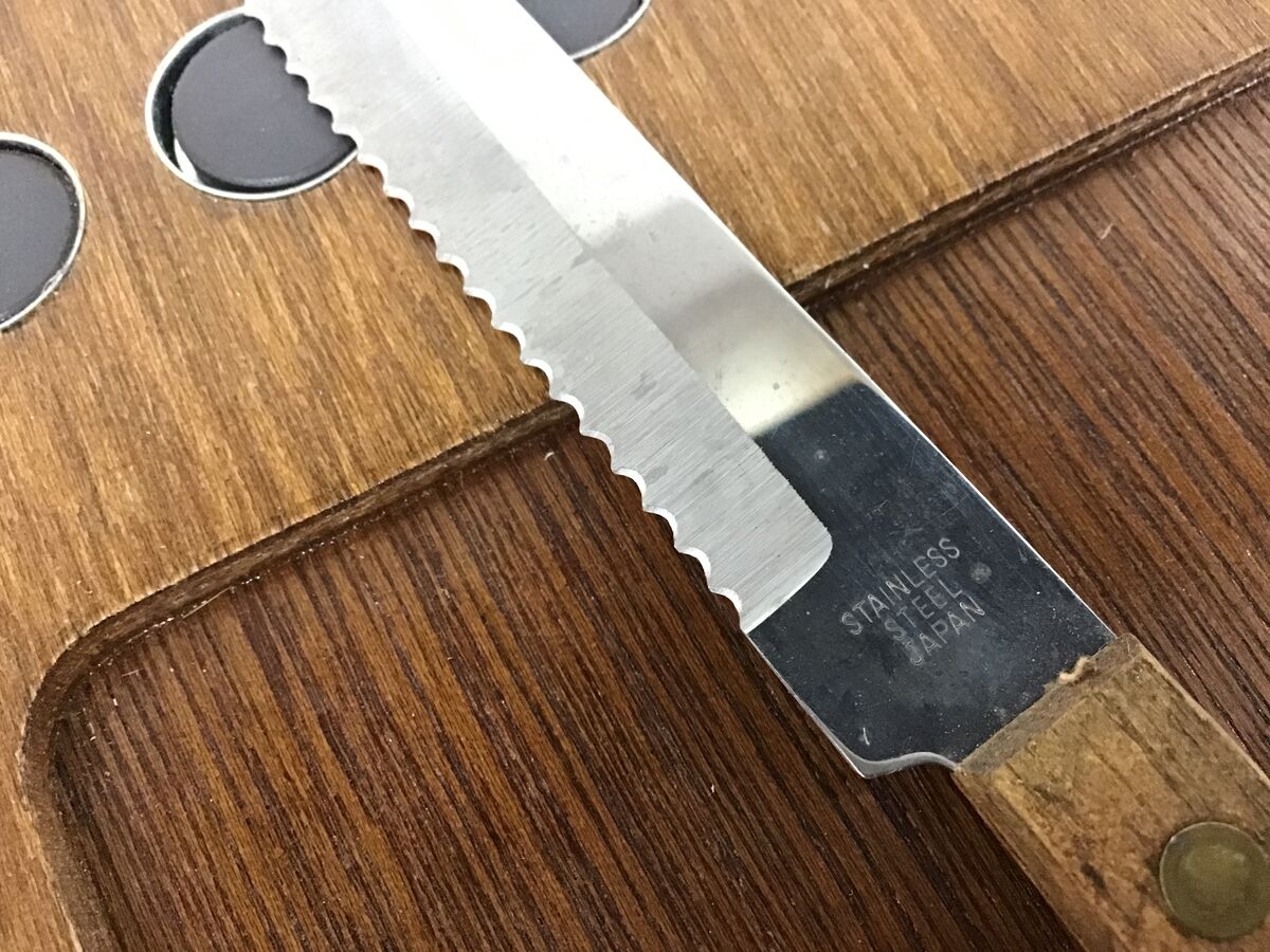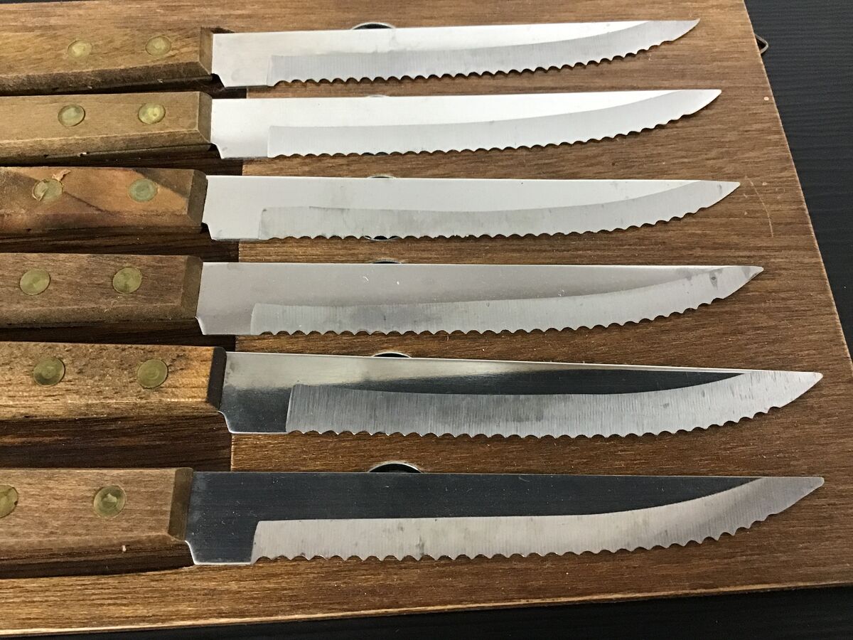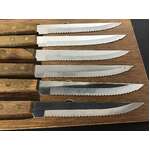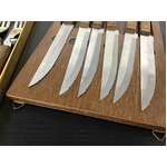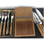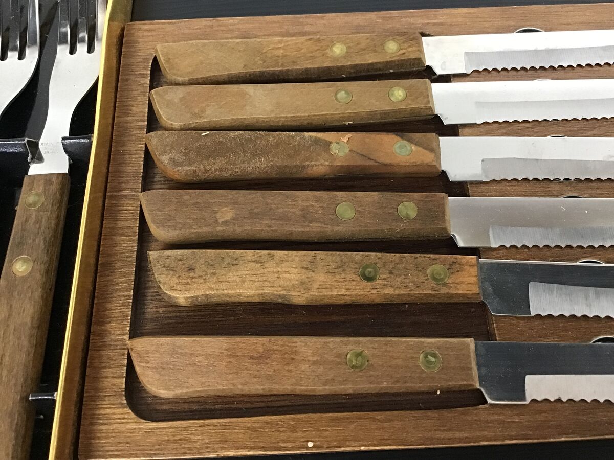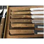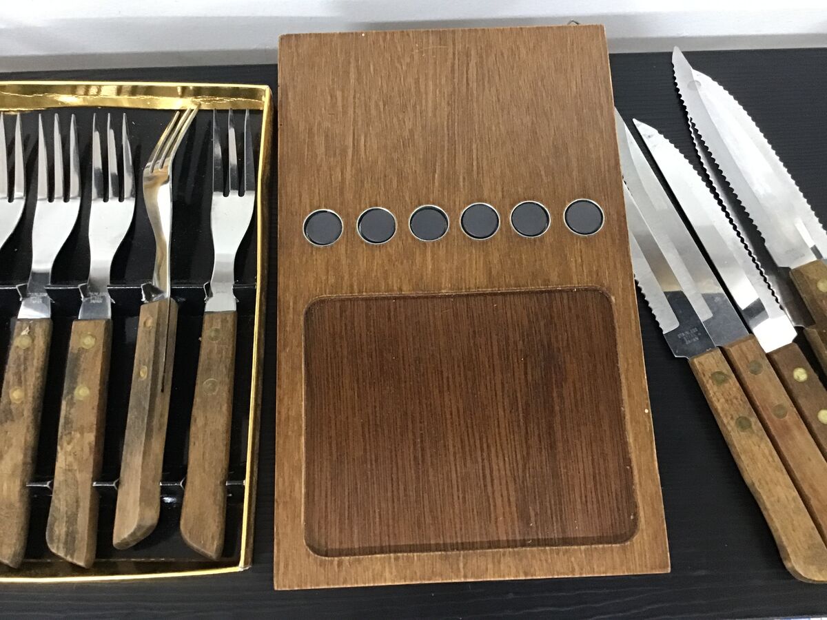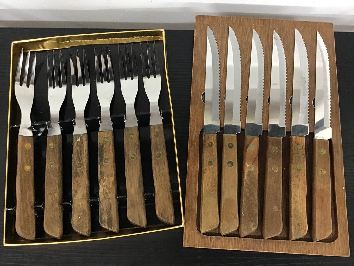 Boxed set of 6 wooden handled steak forks and 6 matching serrated steak knives on a wooden wall hanging magnetic holder.