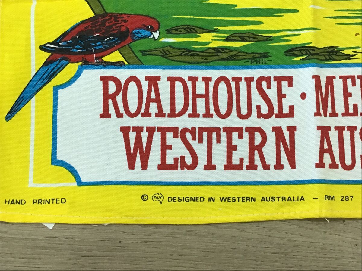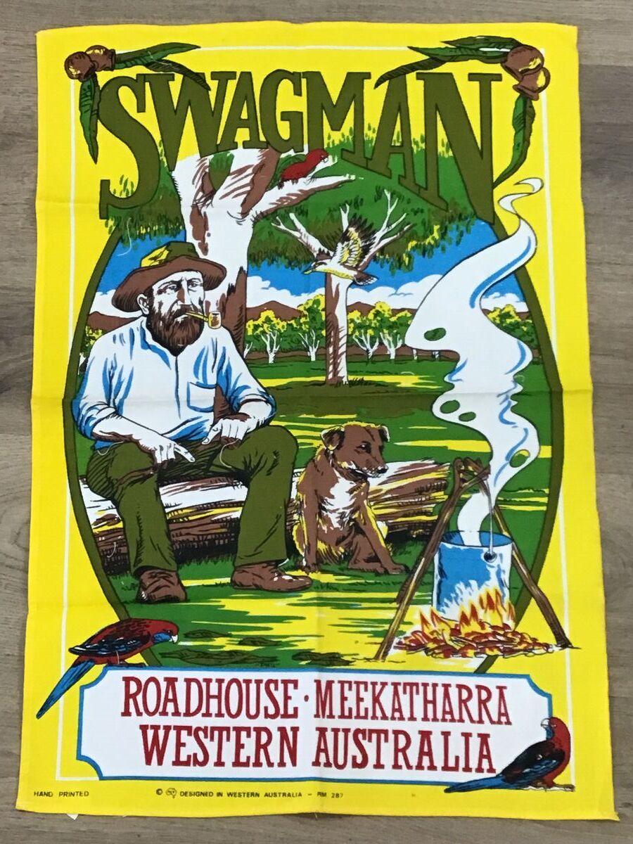Vintage souvenir tea towel, 'Swagman Roadhouse, Meekatharra, Western Australia'