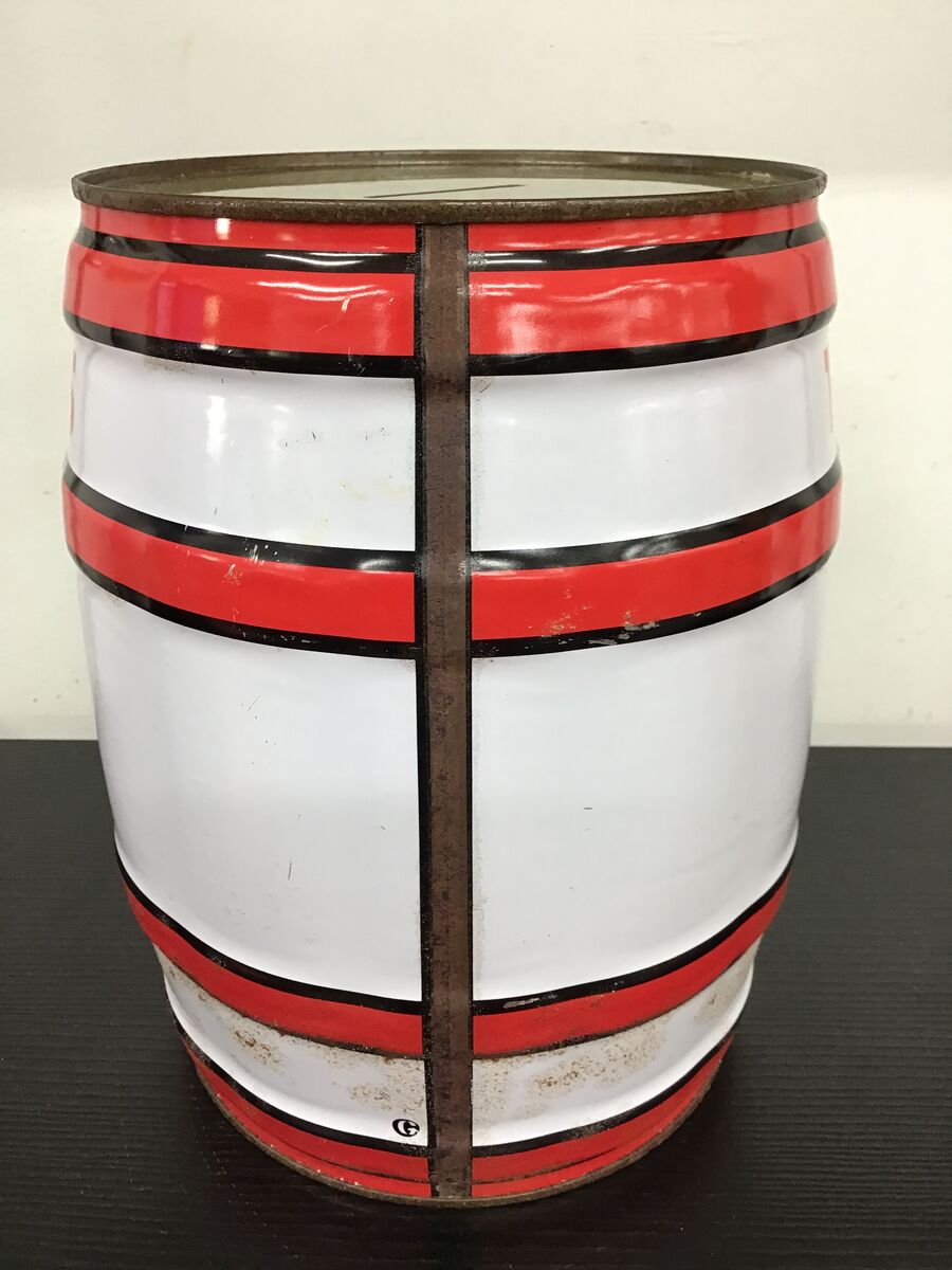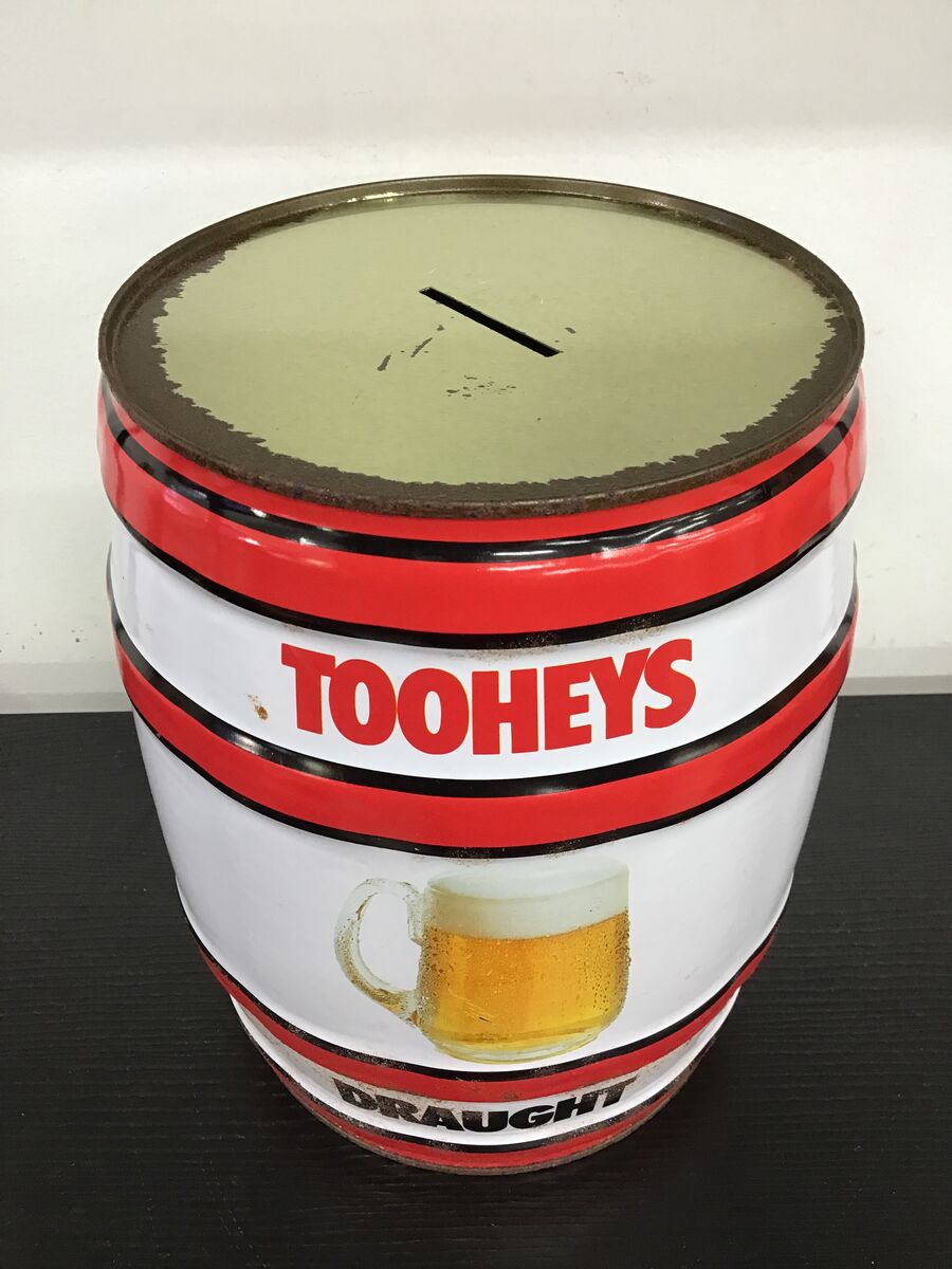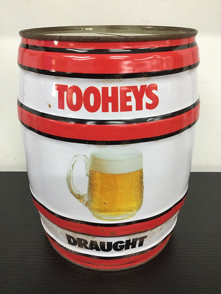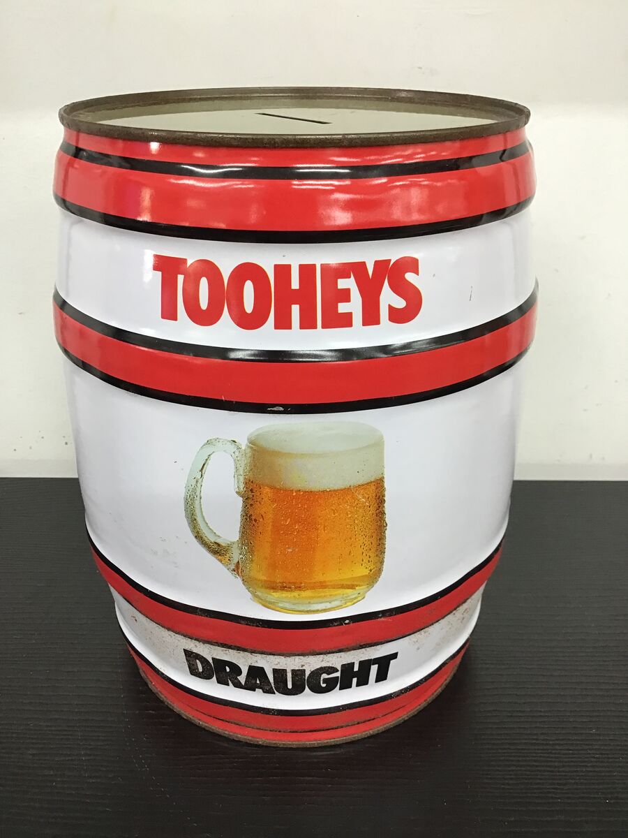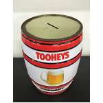 Large barrel/keg shaped tin money box branded for Tooheys Draught.