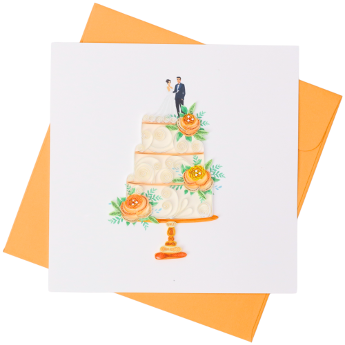 Handmade quilling art card with a wedding cake design.